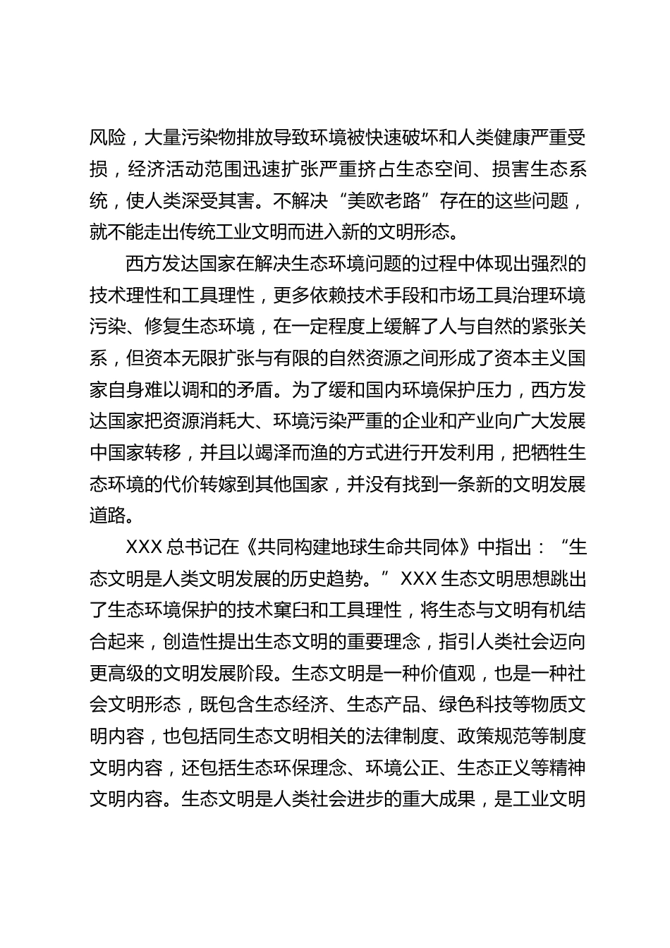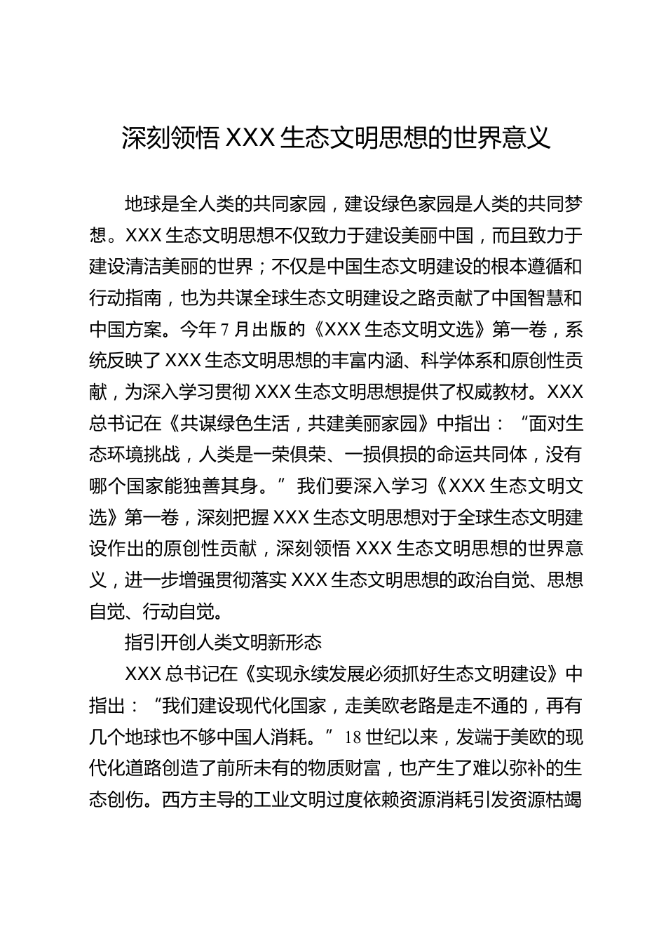 深刻領(lǐng)悟XXX生態(tài)文明思想的世界意義地球是全人類的共同家園,建設(shè)綠色家園是人類的共同夢(mèng)想。XXX生態(tài)文明思想不僅致力于建設(shè)美麗中國,而且致力于建設(shè)清潔美麗的世界;不僅是中國生態(tài)文明建設(shè)的根本遵循和行動(dòng)指南,也為共謀全球生態(tài)文明建設(shè)之路貢獻(xiàn)了中國智慧和中國方案。今年7月出版的《XXX生態(tài)文明文選》第一卷,系統(tǒng)反映了XXX生態(tài)文明思想的豐富內(nèi)涵、科學(xué)體系和原創(chuàng)性貢獻(xiàn),為深入學(xué)習(xí)貫徹XXX生態(tài)文明思想提供了權(quán)威教材。XXX總書記在《共謀綠色生活,共建美麗家園》中指出:“面對(duì)生態(tài)環(huán)境挑戰(zhàn),人類是一榮俱榮、一損俱損的命運(yùn)共同體,沒有哪個(gè)國家能獨(dú)善其身。...