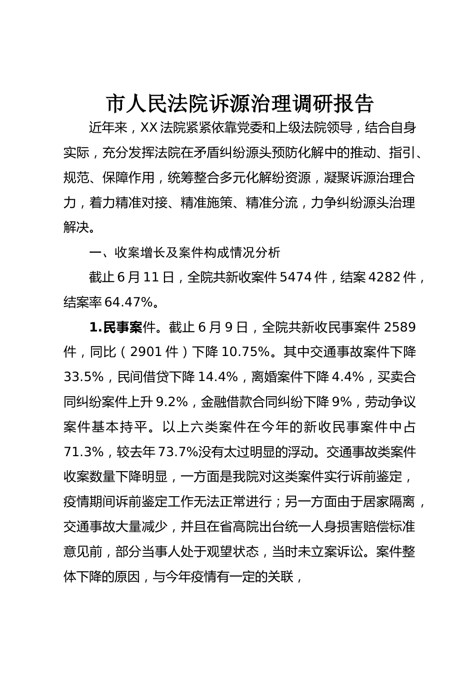 市人民法院訴源治理調(diào)研報(bào)告近年來(lái),XX法院緊緊依靠黨委和上級(jí)法院領(lǐng)導(dǎo),結(jié)合自身實(shí)際,充分發(fā)揮法院在矛盾糾紛源頭預(yù)防化解中的推動(dòng)、指引、規(guī)范、保障作用,統(tǒng)籌整合多元化解紛資源,凝聚訴源治理合力,著力精準(zhǔn)對(duì)接、精準(zhǔn)施策、精準(zhǔn)分流,力爭(zhēng)糾紛源頭治理解決。一、收案增長(zhǎng)及案件構(gòu)成情況分析截止6月11日,全院共新收案件5474件,結(jié)案4282件,結(jié)案率64.47%。1.民事案件。截止6月9日,全院共新收民事案件2589件,同比(2901件)下降10.75%。其中交通事故案件下降33.5%,民間借貸下降14.4%,離婚案件下降4.4%,買(mǎi)賣(mài)合同糾紛案件上升9.2%,金融借款合同糾紛下降9%,勞...