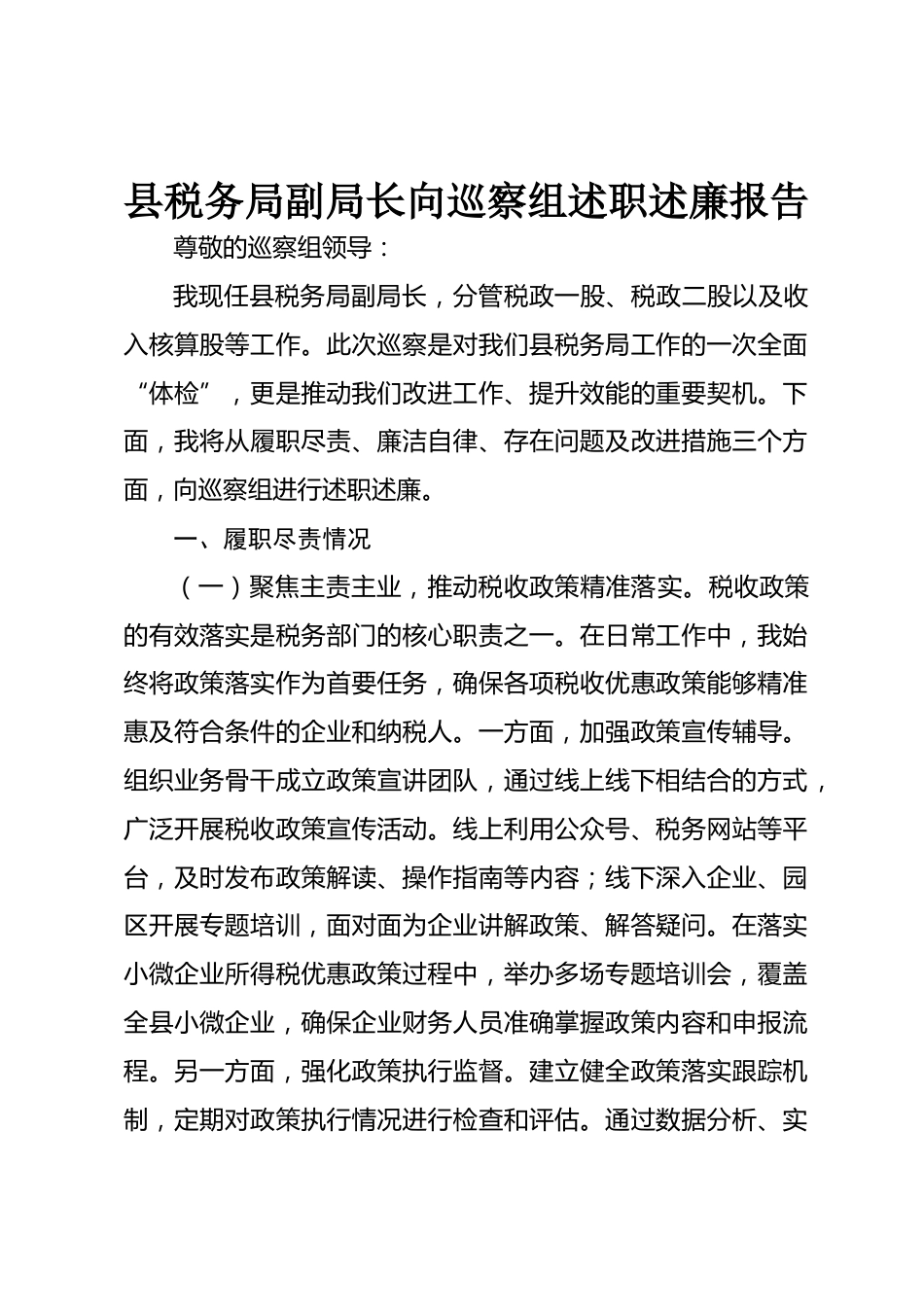 縣稅務(wù)局副局長向巡察組述職述廉報告尊敬的巡察組領(lǐng)導(dǎo):我現(xiàn)任縣稅務(wù)局副局長,分管稅政一股、稅政二股以及收入核算股等工作。此次巡察是對我們縣稅務(wù)局工作的一次全面“體檢”,更是推動我們改進(jìn)工作、提升效能的重要契機(jī)。下面,我將從履職盡責(zé)、廉潔自律、存在問題及改進(jìn)措施三個方面,向巡察組進(jìn)行述職述廉。一、履職盡責(zé)情況(一)聚焦主責(zé)主業(yè),推動稅收政策精準(zhǔn)落實。稅收政策的有效落實是稅務(wù)部門的核心職責(zé)之一。在日常工作中,我始終將政策落實作為首要任務(wù),確保各項稅收優(yōu)惠政策能夠精準(zhǔn)惠及符合條件的企業(yè)和納稅人。一方面,加強(qiáng)政策宣傳輔導(dǎo)。組織業(yè)務(wù)骨干...