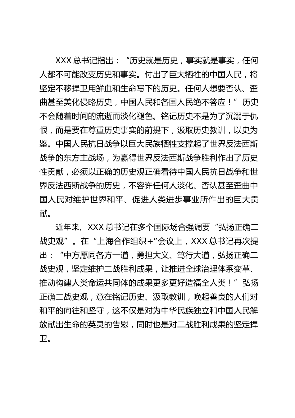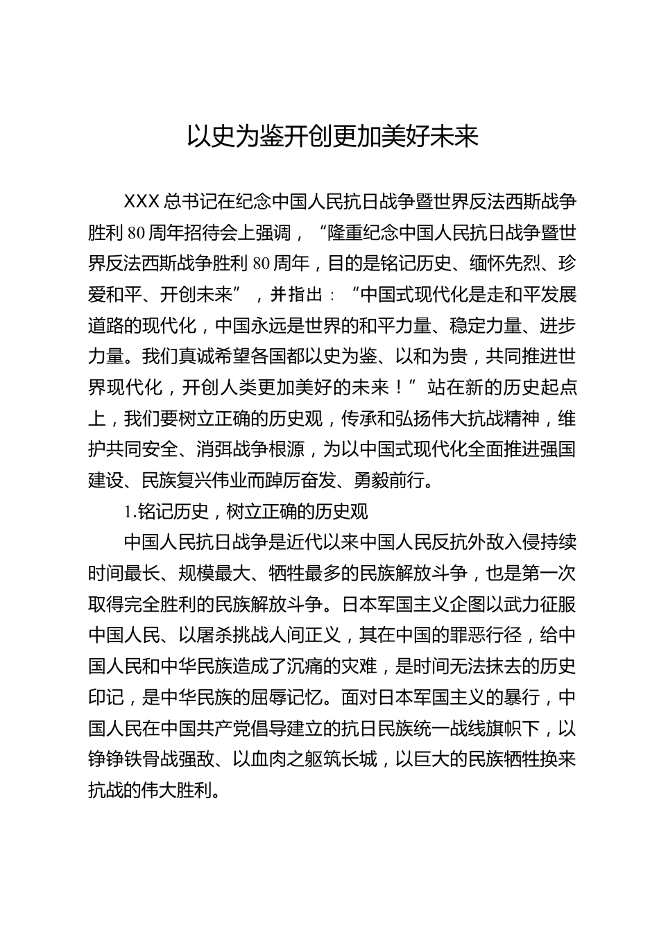 以史為鑒開創(chuàng)更加美好未來XXX總書記在紀念中國人民抗日戰(zhàn)爭暨世界反法西斯戰(zhàn)爭勝利80周年招待會上強調(diào),“隆重紀念中國人民抗日戰(zhàn)爭暨世界反法西斯戰(zhàn)爭勝利80周年,目的是銘記歷史、緬懷先烈、珍愛和平、開創(chuàng)未來”,并指出:“中國式現(xiàn)代化是走和平發(fā)展道路的現(xiàn)代化,中國永遠是世界的和平力量、穩(wěn)定力量、進步力量。我們真誠希望各國都以史為鑒、以和為貴,共同推進世界現(xiàn)代化,開創(chuàng)人類更加美好的未來!”站在新的歷史起點上,我們要樹立正確的歷史觀,傳承和弘揚偉大抗戰(zhàn)精神,維護共同安全、消弭戰(zhàn)爭根源,為以中國式現(xiàn)代化全面推進強國建設(shè)、民族復(fù)興偉業(yè)而踔厲奮...