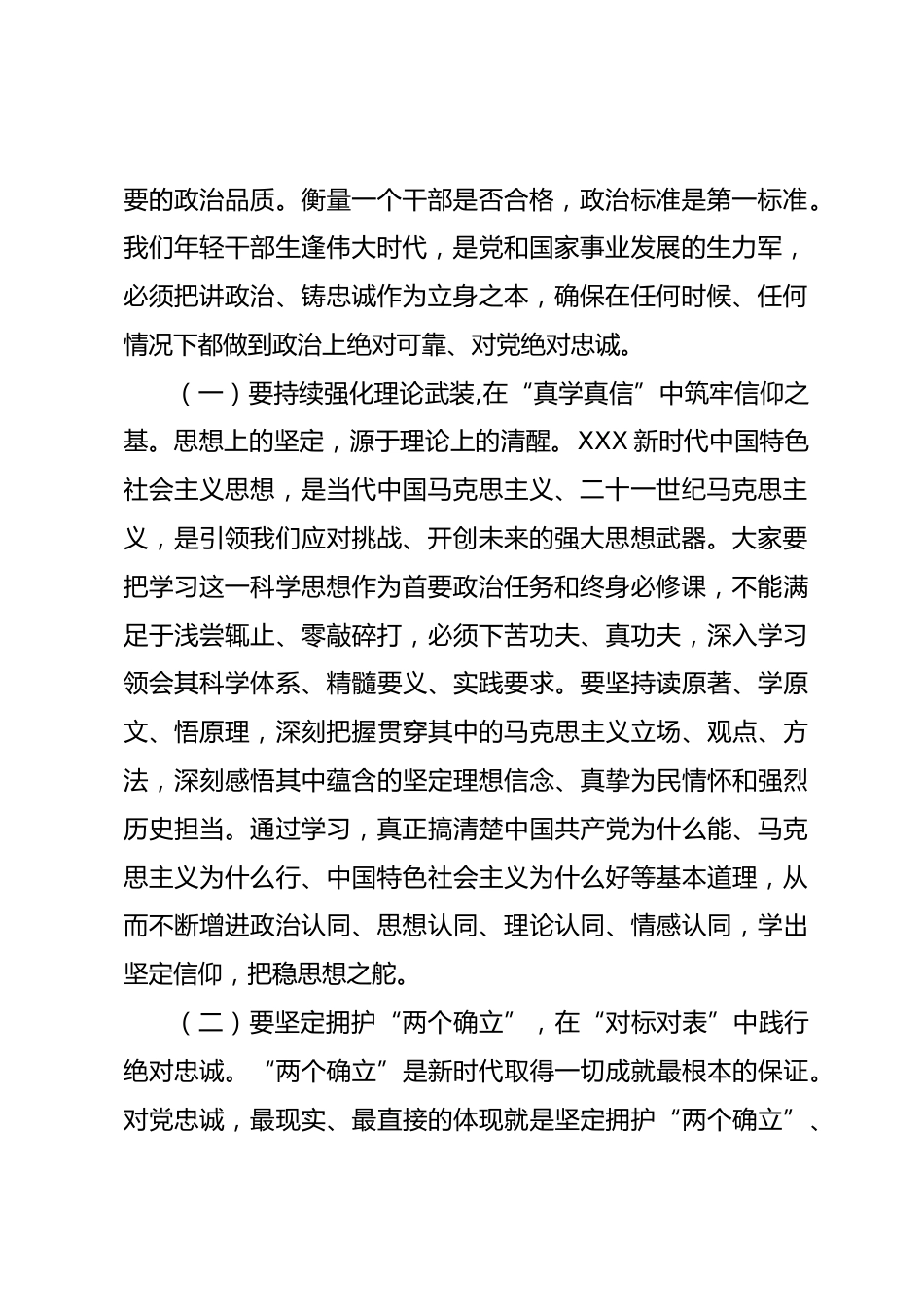 在2025年全縣鄉(xiāng)科級(jí)干部進(jìn)修班暨中青年干部培訓(xùn)班上的專題黨課同志們:今天,我們?cè)谶@里舉辦全縣鄉(xiāng)科級(jí)干部進(jìn)修班暨中青年干部培訓(xùn)班,這既是深入學(xué)習(xí)貫徹XXX新時(shí)代中國(guó)特色社會(huì)主義思想和黨的二十大精神的具體行動(dòng),也是著眼于*縣未來(lái)發(fā)展、加強(qiáng)高素質(zhì)干部隊(duì)伍建設(shè)的關(guān)鍵之舉。在座的各位,都是全縣干部隊(duì)伍的中堅(jiān)力量和未來(lái)希望??h委對(duì)大家寄予厚望,希望同志們珍惜這次寶貴的學(xué)習(xí)機(jī)會(huì),沉下心來(lái)學(xué)思踐悟,為推動(dòng)*縣高質(zhì)量發(fā)展蓄勢(shì)賦能。當(dāng)前,我們正處在一個(gè)船到中流浪更急、人到半山路更陡的特殊時(shí)期。從發(fā)展階段看,我們正處于推動(dòng)高質(zhì)量發(fā)展的攻堅(jiān)期;從改革任務(wù)...