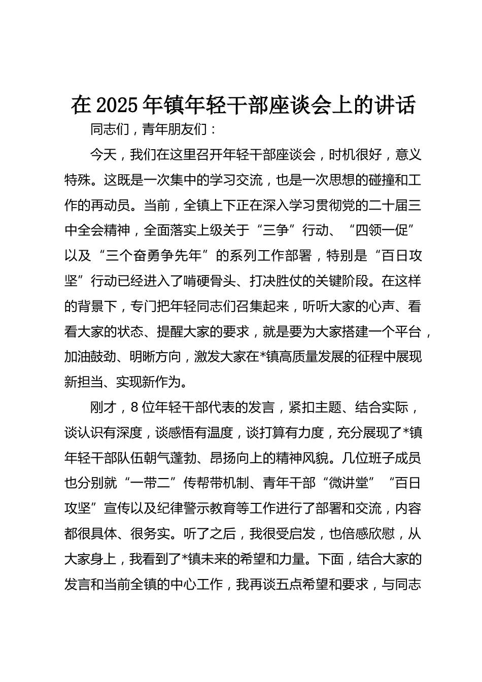 在2025年鎮(zhèn)年輕干部座談會上的講話