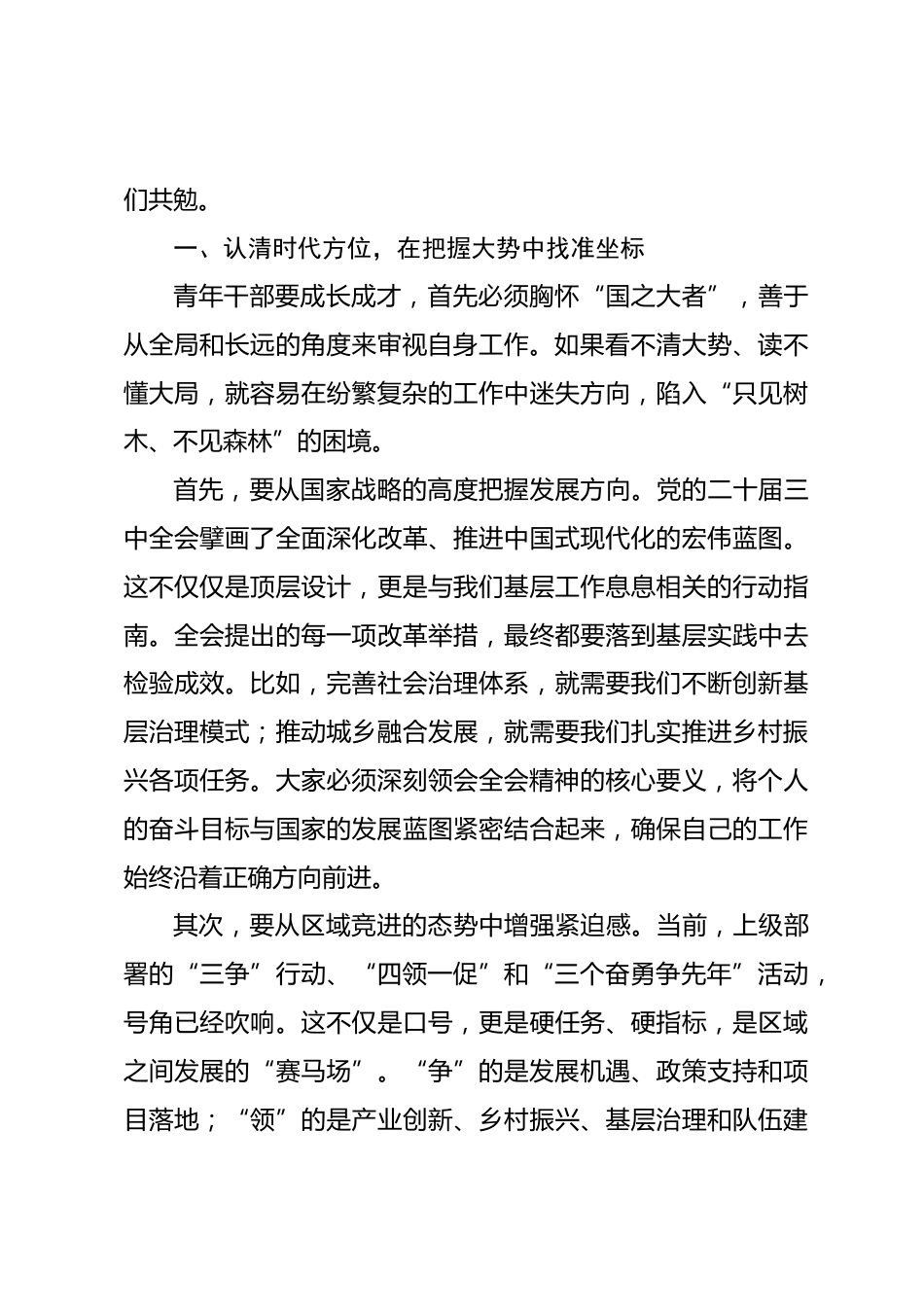 在2025年鎮(zhèn)年輕干部座談會上的講話同志們,青年朋友們:今天,我們在這里召開年輕干部座談會,時機很好,意義特殊。這既是一次集中的學(xué)習(xí)交流,也是一次思想的碰撞和工作的再動員。當(dāng)前,全鎮(zhèn)上下正在深入學(xué)習(xí)貫徹黨的二十屆三中全會精神,全面落實上級關(guān)于“三爭”行動、“四領(lǐng)一促”以及“三個奮勇爭先年”的系列工作部署,特別是“百日攻堅”行動已經(jīng)進(jìn)入了啃硬骨頭、打決勝仗的關(guān)鍵階段。在這樣的背景下,專門把年輕同志們召集起來,聽聽大家的心聲、看看大家的狀態(tài)、提醒大家的要求,就是要為大家搭建一個平臺,加油鼓勁、明晰方向,激發(fā)大家在*鎮(zhèn)高質(zhì)量發(fā)展的征程...
