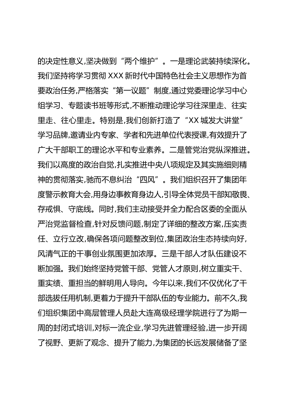 在XX集團決戰(zhàn)決勝四季度動員部署會上的講話(精品)同志們:剛才,XX總經理全面、系統(tǒng)地總結了集團前三季度的工作,客觀分析了當前面臨的形勢和挑戰(zhàn),并對第四季度各項重點任務進行了周密部署,我都完全贊同。XX總經理的報告既有詳實的數(shù)據支撐,又有明確的工作路徑,目標清晰、措施有力,為我們打贏年底收官戰(zhàn)指明了方向。下面,我再講幾點意見,主要是和大家統(tǒng)一思想、凝聚共識、鼓舞干勁,確保我們以決戰(zhàn)決勝的姿態(tài),全力沖刺,圓滿完成全年各項目標任務。一、回顧來路,我們在攻堅克難中砥礪前行,高質量發(fā)展根基更加堅實今年是“十四五”規(guī)劃的收官之年,也是集團深化改革、轉型發(fā)展...