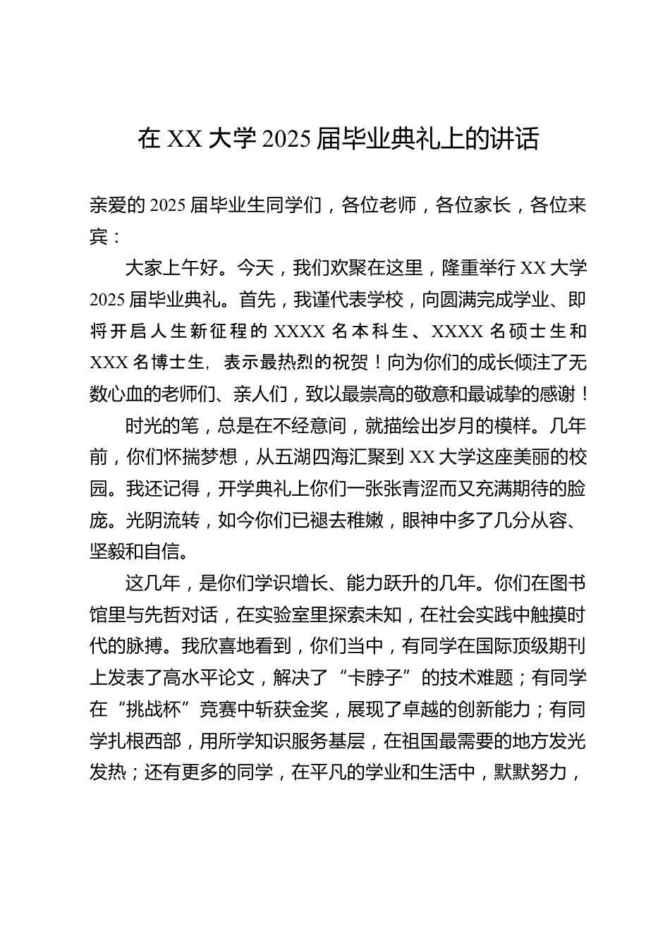 在XX大學2025屆畢業(yè)典禮上的講話親愛的2025屆畢業(yè)生同學們,各位老師,各位家長,各位來賓:大家上午好。今天,我們歡聚在這里,隆重舉行XX大學2025屆畢業(yè)典禮。首先,我謹代表學校,向圓滿完成學業(yè)、即將開啟人生新征程的XXXX名本科生、XXXX名士生和碩XXX名博士生,表示最熱烈的祝賀!向為你們的成長傾注了無數(shù)心血的老師們、親人們,致以最崇高的敬意和最誠摯的感謝!時光的筆,總是在不經(jīng)意間,就描繪出歲月的模樣。幾年前,你們懷揣夢想,從五湖四海匯聚到XX大學這座美麗的校園。我還記得,開學典禮上你們一張張青澀而又充滿期待的臉龐。光陰流轉,如今你們已褪去稚...