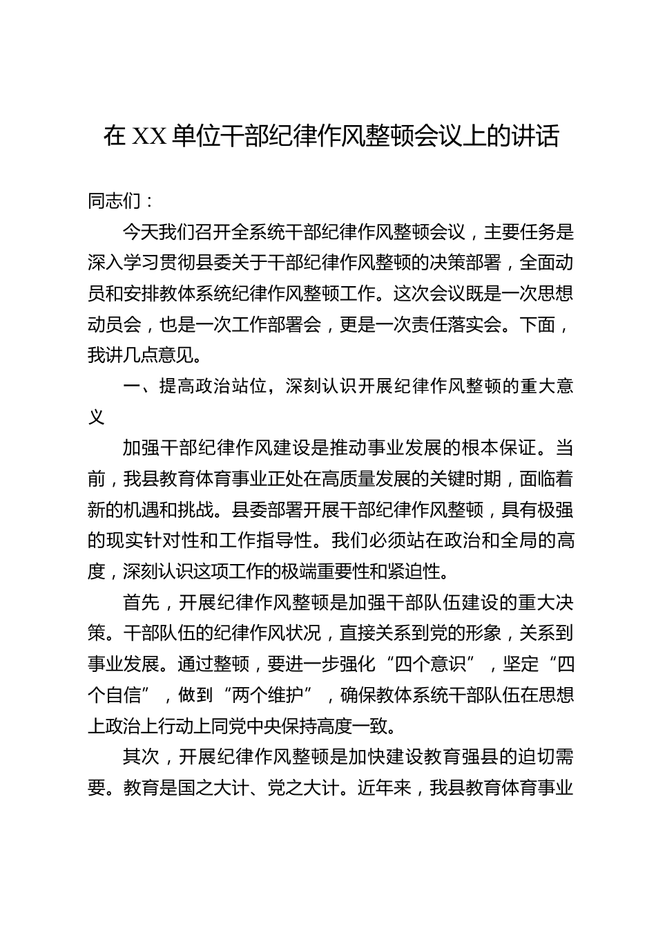 在XX單位干部紀(jì)律作風(fēng)整頓會議上的講話同志們:今天我們召開全系統(tǒng)干部紀(jì)律作風(fēng)整頓會議,主要任務(wù)是深入學(xué)習(xí)貫徹縣委關(guān)于干部紀(jì)律作風(fēng)整頓的決策部署,全面動員和安排教體系統(tǒng)紀(jì)律作風(fēng)整頓工作。這次會議既是一次思想動員會,也是一次工作部署會,更是一次責(zé)任落實(shí)會。下面,我講幾點(diǎn)意見。一、提高政治站位,深刻認(rèn)識開展紀(jì)律作風(fēng)整頓的重大意義加強(qiáng)干部紀(jì)律作風(fēng)建設(shè)是推動事業(yè)發(fā)展的根本保證。當(dāng)前,我縣教育體育事業(yè)正處在高質(zhì)量發(fā)展的關(guān)鍵時(shí)期,面臨著新的機(jī)遇和挑戰(zhàn)??h委部署開展干部紀(jì)律作風(fēng)整頓,具有極強(qiáng)的現(xiàn)實(shí)針對性和工作指導(dǎo)性。我們必須站在政治和全局的高...