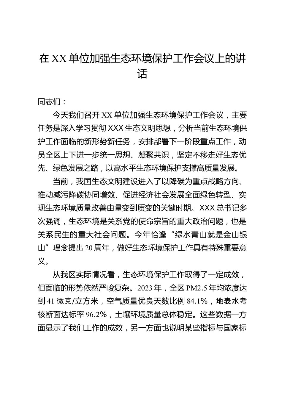 在XX單位加強生態(tài)環(huán)境保護工作會議上的講話同志們:今天我們召開XX單位加強生態(tài)環(huán)境保護工作會議,主要任務(wù)是深入學(xué)習(xí)貫徹XXX生態(tài)文明思想,分析當(dāng)前生態(tài)環(huán)境保護工作面臨的新形勢新任務(wù),安排部署下一階段重點工作,動員全區(qū)上下進一步統(tǒng)一思想、凝聚共識,堅定不移走好生態(tài)優(yōu)先、綠色發(fā)展之路,以高水平生態(tài)環(huán)境保護支撐高質(zhì)量發(fā)展。當(dāng)前,我國生態(tài)文明建設(shè)進入了以降碳為重點戰(zhàn)略方向、推動減污降碳協(xié)同增效、促進經(jīng)濟社會發(fā)展全面綠色轉(zhuǎn)型、實現(xiàn)生態(tài)環(huán)境質(zhì)量改善由量變到質(zhì)變的關(guān)鍵時期。XXX總書記多次強調(diào),生態(tài)環(huán)境是關(guān)系黨的使命宗旨的重大政治問題,也是關(guān)系民生...