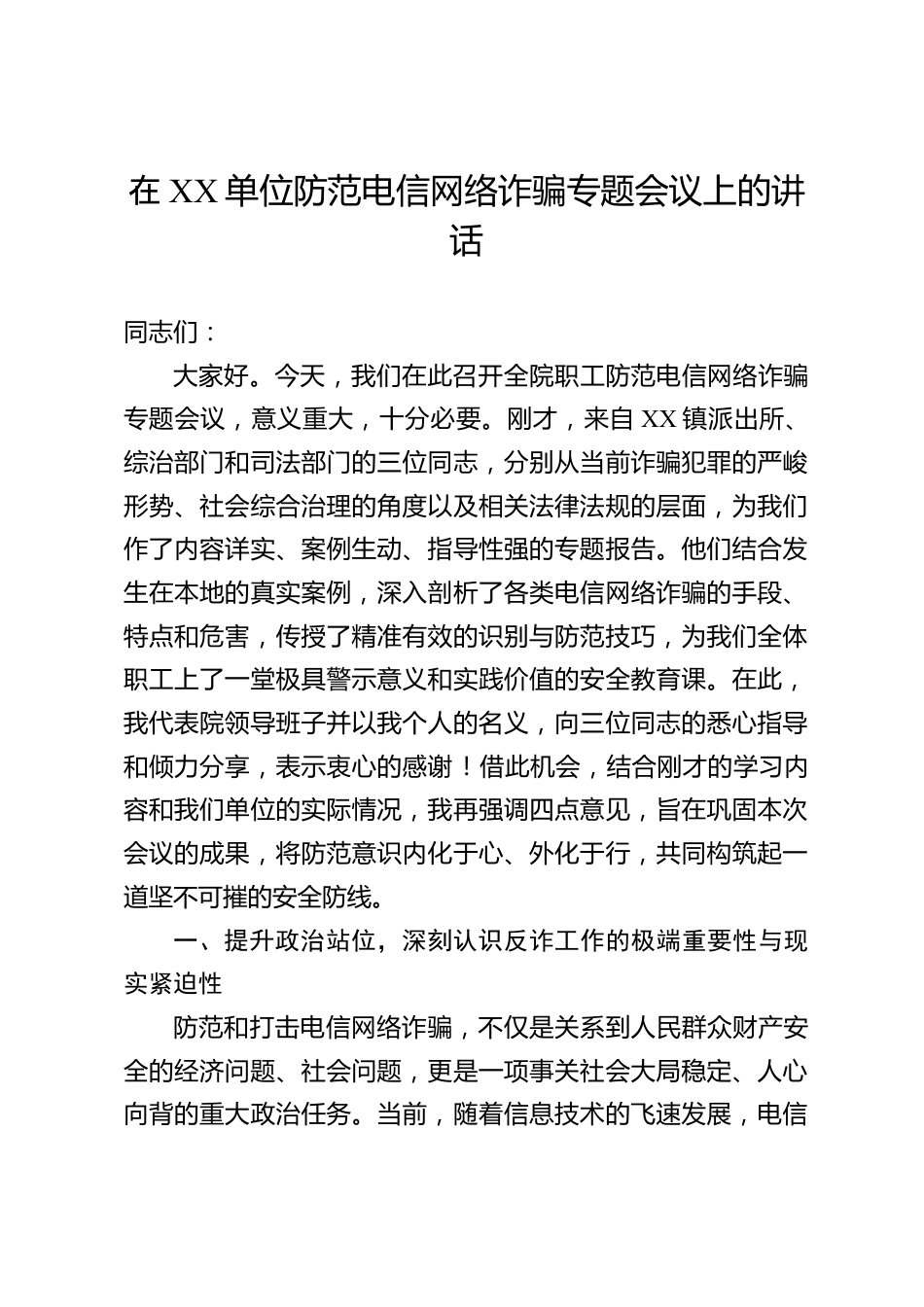 在XX單位防范電信網(wǎng)絡(luò)詐騙專題會議上的講話同志們:大家好。今天,我們在此召開全院職工防范電信網(wǎng)絡(luò)詐騙專題會議,意義重大,十分必要。剛才,來自XX鎮(zhèn)派出所、綜治部門和司法部門的三位同志,分別從當(dāng)前詐騙犯罪的嚴(yán)峻形勢、社會綜合治理的角度以及相關(guān)法律法規(guī)的層面,為我們作了內(nèi)容詳實(shí)、案例生動、指導(dǎo)性強(qiáng)的專題報(bào)告。他們結(jié)合發(fā)生在本地的真實(shí)案例,深入剖析了各類電信網(wǎng)絡(luò)詐騙的手段、特點(diǎn)和危害,傳授了精準(zhǔn)有效的識別與防范技巧,為我們?nèi)w職工上了一堂極具警示意義和實(shí)踐價(jià)值的安全教育課。在此,我代表院領(lǐng)導(dǎo)班子并以我個(gè)人的名義,向三位同志的悉心指導(dǎo)和...