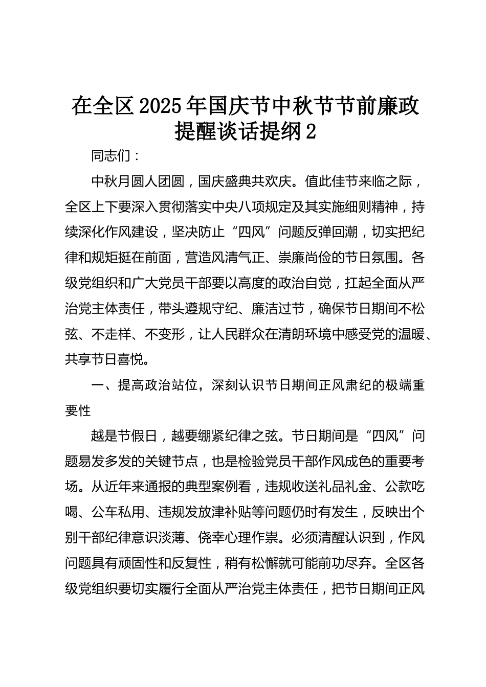 在全區(qū)2025年國(guó)慶節(jié)中秋節(jié)節(jié)前廉政提醒談話提綱2同志們:中秋月圓人團(tuán)圓,國(guó)慶盛典共歡慶。值此佳節(jié)來(lái)臨之際,全區(qū)上下要深入貫徹落實(shí)中央八項(xiàng)規(guī)定及其實(shí)施細(xì)則精神,持續(xù)深化作風(fēng)建設(shè),堅(jiān)決防止“四風(fēng)”問(wèn)題反彈回潮,切實(shí)把紀(jì)律和規(guī)矩挺在前面,營(yíng)造風(fēng)清氣正、崇廉尚儉的節(jié)日氛圍。各級(jí)黨組織和廣大黨員干部要以高度的政治自覺(jué),扛起全面從嚴(yán)治黨主體責(zé)任,帶頭遵規(guī)守紀(jì)、廉潔過(guò)節(jié),確保節(jié)日期間不松弦、不走樣、不變形,讓人民群眾在清朗環(huán)境中感受黨的溫暖、共享節(jié)日喜悅。一、提高政治站位,深刻認(rèn)識(shí)節(jié)日期間正風(fēng)肅紀(jì)的極端重要性越是節(jié)假日,越要繃緊紀(jì)律之弦。節(jié)...