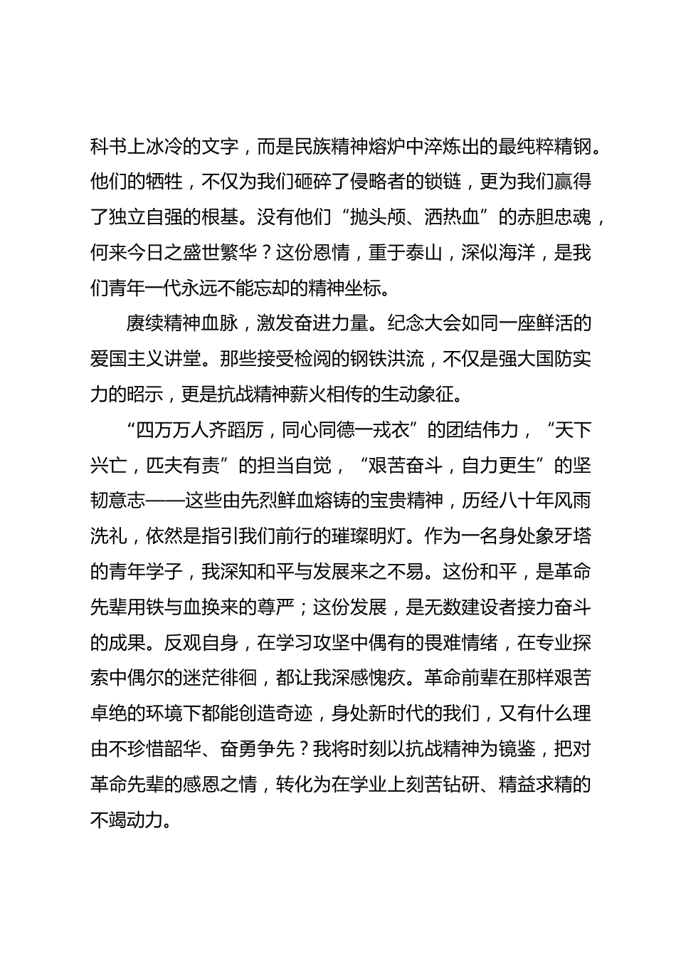 (5篇)觀看紀念中國人民抗日戰(zhàn)爭暨世界反法西斯戰(zhàn)爭勝利xx周年大會心得體會匯編觀看紀念中國人民抗日戰(zhàn)爭暨世界反法西斯戰(zhàn)爭勝利xx周年大會心得體會此時此刻,我懷著無比崇敬與激動的心情,因為最核心的觸動,來自于x月x日在天安門廣場隆重舉行的中國人民抗日戰(zhàn)爭暨世界反法西斯戰(zhàn)爭勝利xx周年紀念大會,習(xí)近平總書記的重要講話和盛大閱兵儀式,讓我接受了一次深刻的精神洗禮。那震撼人心的一幕幕,宛如歷史的鐘聲在耳畔久久回響,讓我對民族獨立、人民解放的艱辛求索,有了更深刻地認識;對肩負的時代使命,有了更堅定地自覺。銘記偉大勝利,感恩如山恩情。當(dāng)雄壯的國...