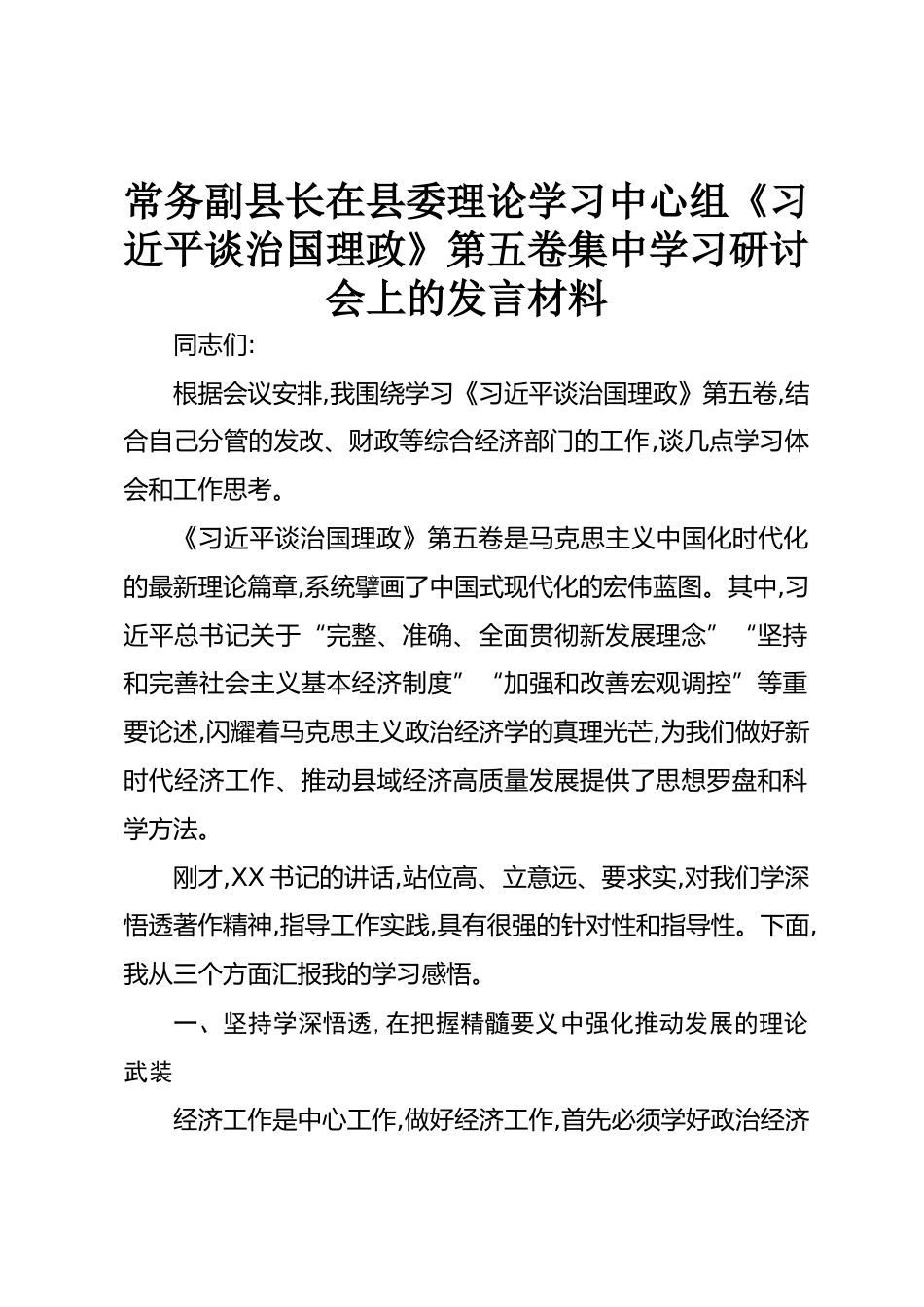 常務(wù)副縣長在縣委理論學(xué)習(xí)中心組《習(xí)近平談治國理政》第五卷集中學(xué)習(xí)研討會上的發(fā)言材料