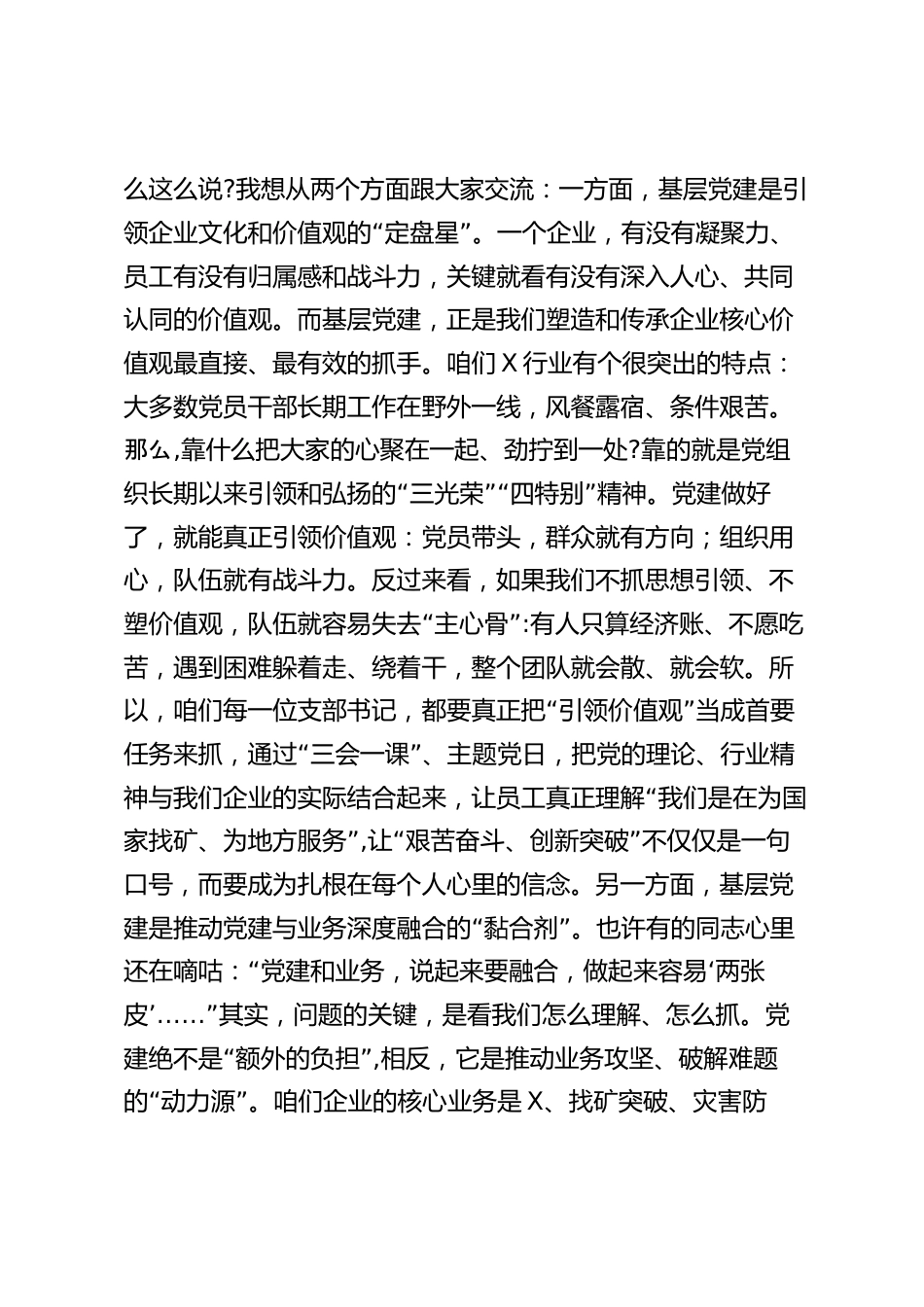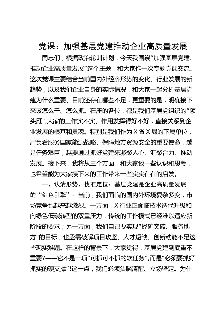 黨課:加強(qiáng)基層黨建推動(dòng)企業(yè)高質(zhì)量發(fā)展“同志們,根據(jù)政治輪訓(xùn)計(jì)劃,今天我圍繞加強(qiáng)基層黨建、”推動(dòng)企業(yè)高質(zhì)量發(fā)展這個(gè)主題,和大家作一次專題黨課交流。這次黨課主要結(jié)合當(dāng)前國(guó)內(nèi)外經(jīng)濟(jì)形勢(shì)的變化、行業(yè)發(fā)展的新趨勢(shì),以及我們企業(yè)自身的實(shí)際情況,和大家一起分析基層黨建為什么重要、目前還存在哪些不足,更重要的是,明確接下“來(lái)該怎么干、怎么抓。在座的各位,都是我們基層黨組織的領(lǐng)”頭雁,大家的工作實(shí)不實(shí)、作用發(fā)揮得好不好,直接關(guān)系到企業(yè)發(fā)展的根基和靈魂。特別是我們作為X省X局的下屬單位,肩負(fù)著服務(wù)國(guó)家能源戰(zhàn)略、保障地方資源安全的重要使命,越是任務(wù)...