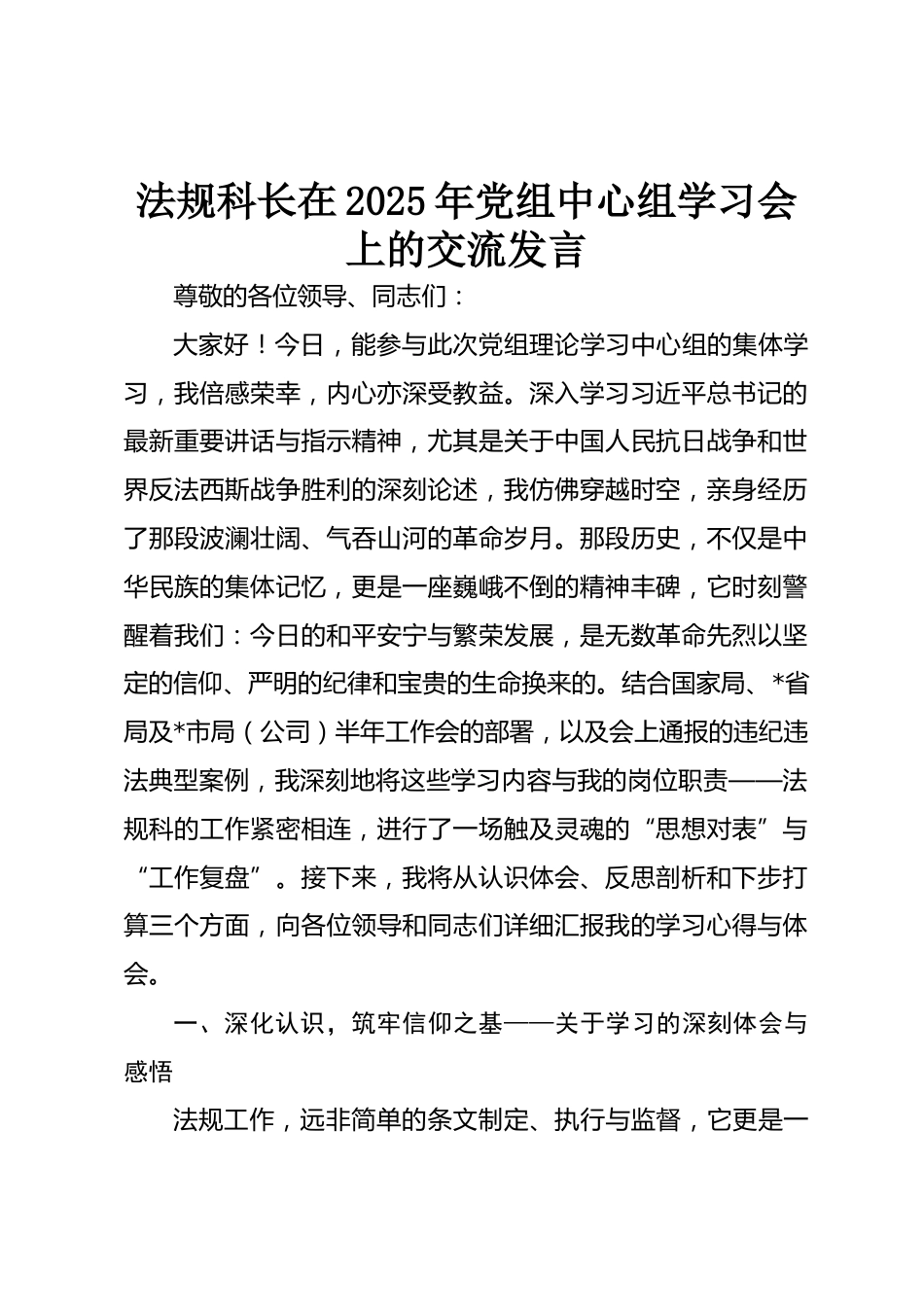 法規(guī)科長在2025年黨組中心組學(xué)習(xí)會上的交流發(fā)言