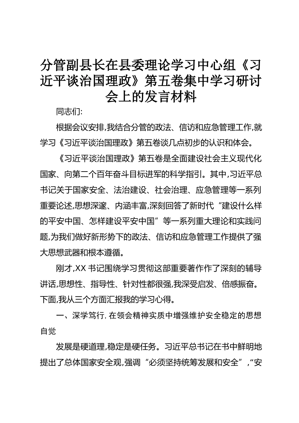 分管副縣長在縣委理論學習中心組《習近平談治國理政》第五卷集中學習研討會上的發(fā)言材料同志們:根據(jù)會議安排,我結合分管的政法、信訪和應急管理工作,就學習《習近平談治國理政》第五卷談幾點初步的認識和體會。《習近平談治國理政》第五卷是全面建設社會主義現(xiàn)代化國家、向第二個百年奮斗目標進軍的科學指引。其中,習近平總書記關于國家安全、法治建設、社會治理、應急管理等一系列重要論述,思想深邃、內(nèi)涵豐富,深刻回答了新時代“建設什么樣的平安中國、怎樣建設平安中國”等一系列重大理論和實踐問題,為我們做好新形勢下的政法、信訪和應急管理工作提供了強大思想武器...