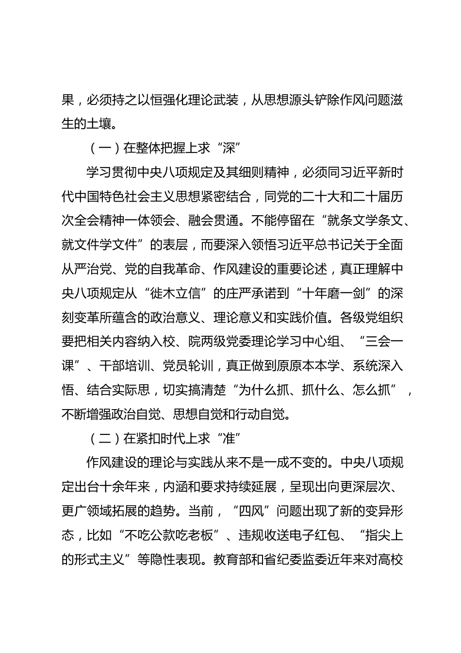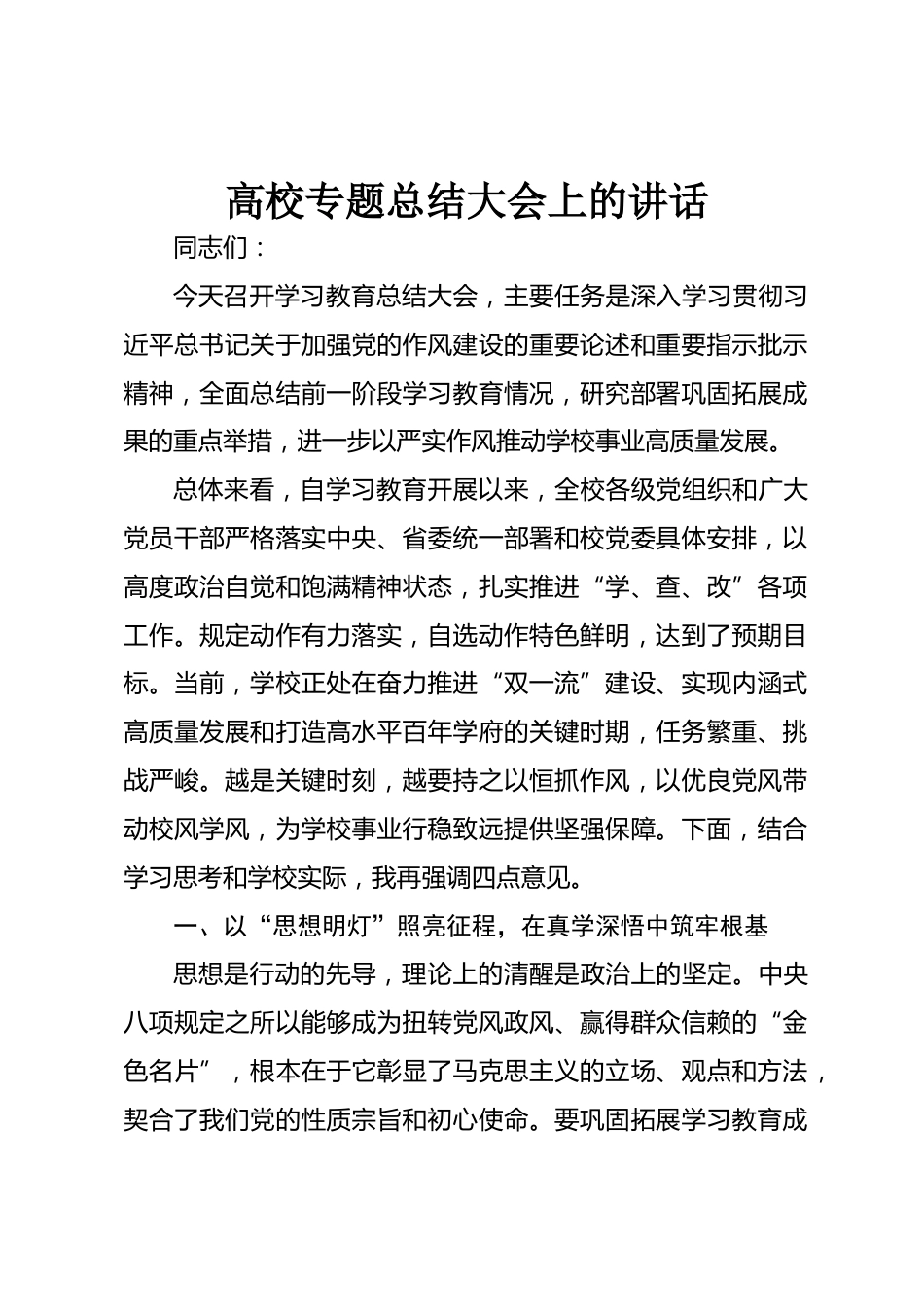 高校專題總結(jié)大會上的講話同志們:今天召開學(xué)習(xí)教育總結(jié)大會,主要任務(wù)是深入學(xué)習(xí)貫徹習(xí)近平總書記關(guān)于加強黨的作風(fēng)建設(shè)的重要論述和重要指示批示精神,全面總結(jié)前一階段學(xué)習(xí)教育情況,研究部署鞏固拓展成果的重點舉措,進(jìn)一步以嚴(yán)實作風(fēng)推動學(xué)校事業(yè)高質(zhì)量發(fā)展??傮w來看,自學(xué)習(xí)教育開展以來,全校各級黨組織和廣大黨員干部嚴(yán)格落實中央、省委統(tǒng)一部署和校黨委具體安排,以高度政治自覺和飽滿精神狀態(tài),扎實推進(jìn)“學(xué)、查、改”各項工作。規(guī)定動作有力落實,自選動作特色鮮明,達(dá)到了預(yù)期目標(biāo)。當(dāng)前,學(xué)校正處在奮力推進(jìn)“雙一流”建設(shè)、實現(xiàn)內(nèi)涵式高質(zhì)量發(fā)展和打造高水...