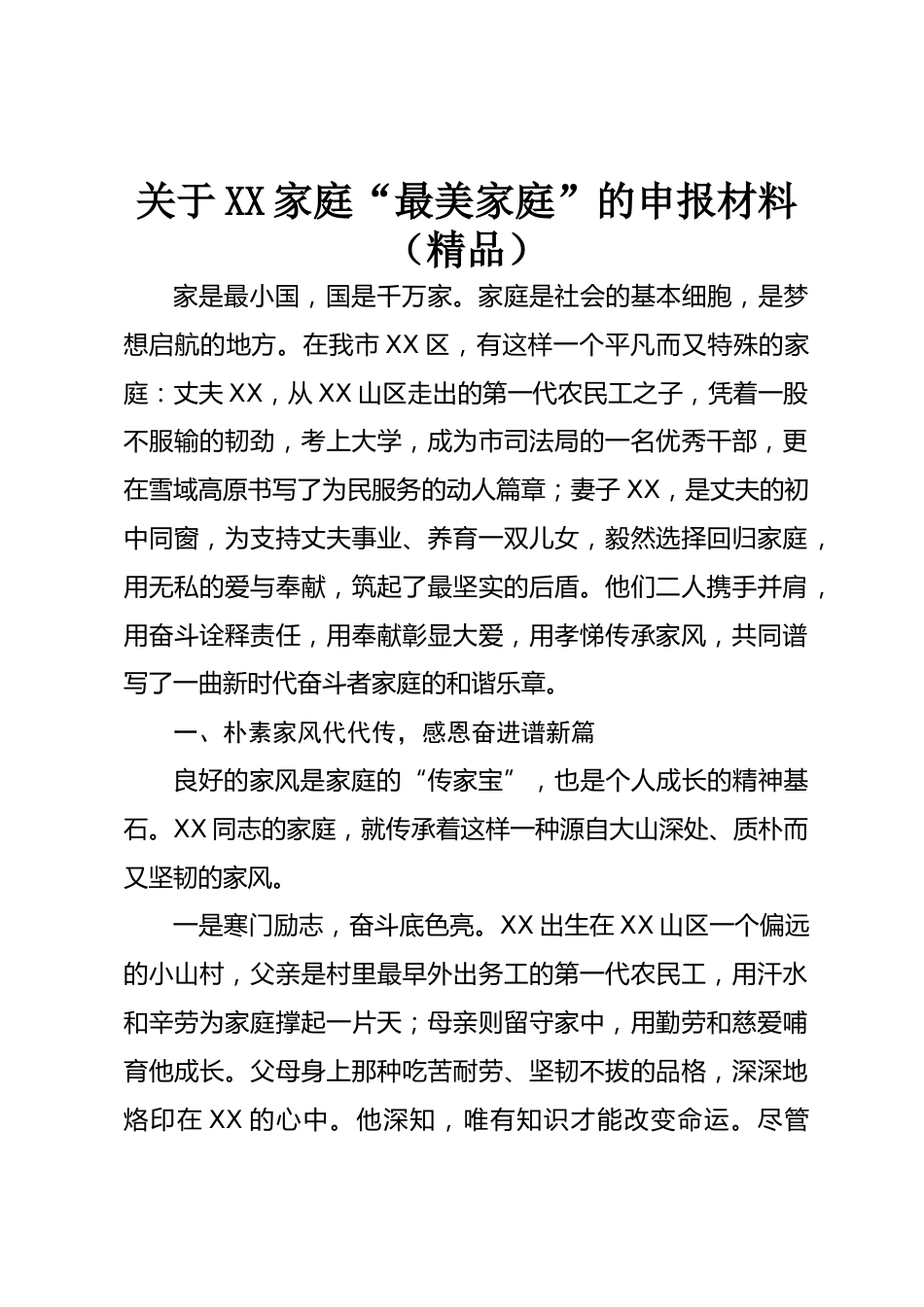 關(guān)于XX家庭“最美家庭”的申報材料(精品)家是最小國,國是千萬家。家庭是社會的基本細胞,是夢想啟航的地方。在我市XX區(qū),有這樣一個平凡而又特殊的家庭:丈夫XX,從XX山區(qū)走出的第一代農(nóng)民工之子,憑著一股不服輸?shù)捻g勁,考上大學,成為市司法局的一名優(yōu)秀干部,更在雪域高原書寫了為民服務(wù)的動人篇章;妻子XX,是丈夫的初中同窗,為支持丈夫事業(yè)、養(yǎng)育一雙兒女,毅然選擇回歸家庭,用無私的愛與奉獻,筑起了最堅實的后盾。他們二人攜手并肩,用奮斗詮釋責任,用奉獻彰顯大愛,用孝悌傳承家風,共同譜寫了一曲新時代奮斗者家庭的和諧樂章。一、樸素家風代代傳,感恩奮...