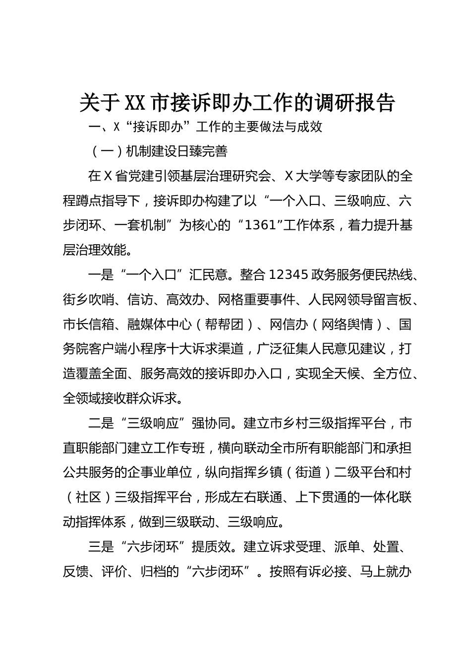 關(guān)于XX市接訴即辦工作的調(diào)研報(bào)告一、X“接訴即辦”工作的主要做法與成效(一)機(jī)制建設(shè)日臻完善在X省黨建引領(lǐng)基層治理研究會(huì)、X大學(xué)等專家團(tuán)隊(duì)的全程蹲點(diǎn)指導(dǎo)下,接訴即辦構(gòu)建了以“一個(gè)入口、三級(jí)響應(yīng)、六步閉環(huán)、一套機(jī)制”為核心的“1361”工作體系,著力提升基層治理效能。一是“一個(gè)入口”匯民意。整合12345政務(wù)服務(wù)便民熱線、街鄉(xiāng)吹哨、信訪、高效辦、網(wǎng)格重要事件、人民網(wǎng)領(lǐng)導(dǎo)留言板、市長(zhǎng)信箱、融媒體中心(幫幫團(tuán))、網(wǎng)信辦(網(wǎng)絡(luò)輿情)、國(guó)務(wù)院客戶端小程序十大訴求渠道,廣泛征集人民意見建議,打造覆蓋全面、服務(wù)高效的接訴即辦入口,實(shí)現(xiàn)全天候、全方位、全...