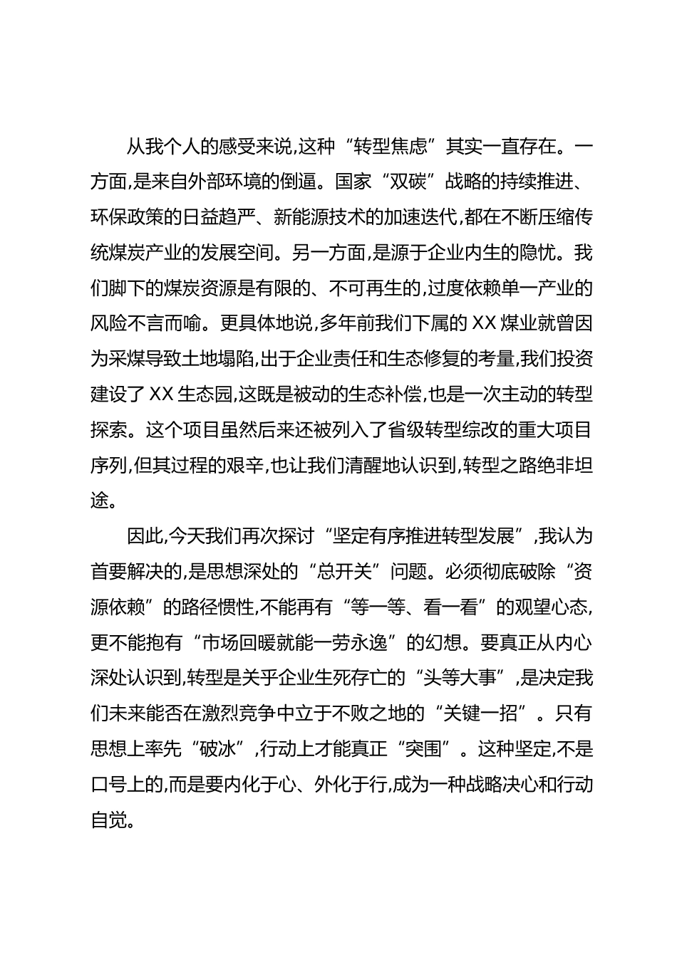 集團(tuán)公司黨委書記“堅(jiān)定有序推進(jìn)轉(zhuǎn)型發(fā)展”研討發(fā)言(精品)同志們:根據(jù)會(huì)議安排,我就圍繞“堅(jiān)定有序推進(jìn)轉(zhuǎn)型發(fā)展”這一核心指示要求,結(jié)合個(gè)人近期的學(xué)習(xí)思考和工作感悟,談幾點(diǎn)不成熟的看法,與大家交流探討。一、深刻領(lǐng)會(huì)“為什么轉(zhuǎn)”的時(shí)代必然,在思想破冰中堅(jiān)定轉(zhuǎn)型自覺“堅(jiān)定有序推進(jìn)轉(zhuǎn)型發(fā)展”,這八個(gè)字言簡意賅,卻重逾千鈞。它不僅是縣委全會(huì)部署的中心任務(wù),更是上級(jí)黨委、市委反復(fù)強(qiáng)調(diào)的戰(zhàn)略方向。轉(zhuǎn)型發(fā)展對資源型地區(qū)而言,不是一道“選擇題”,而是一道繞不開、躲不過的“必答題”;不是一時(shí)之需的權(quán)宜之計(jì),而是關(guān)乎長遠(yuǎn)發(fā)展的根本之策。作為一家以煤炭為根基、因...