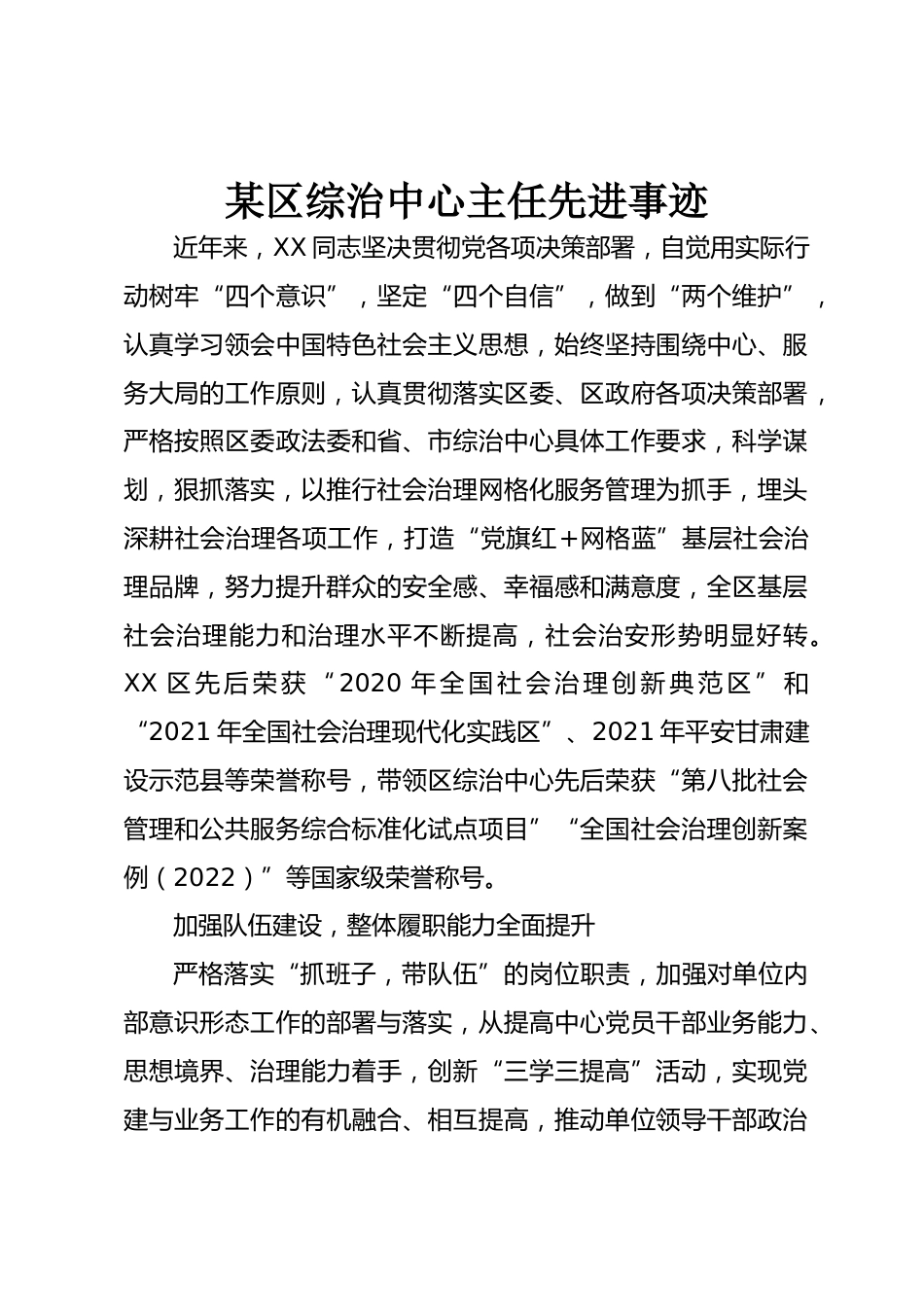 某區(qū)綜治中心主任先進事跡近年來,XX同志堅決貫徹黨各項決策部署,自覺用實際行動樹牢“四個意識”,堅定“四個自信”,做到“兩個維護”,認真學習領(lǐng)會中國特色社會主義思想,始終堅持圍繞中心、服務(wù)大局的工作原則,認真貫徹落實區(qū)委、區(qū)政府各項決策部署,嚴格按照區(qū)委政法委和省、市綜治中心具體工作要求,科學謀劃,狠抓落實,以推行社會治理網(wǎng)格化服務(wù)管理為抓手,埋頭深耕社會治理各項工作,打造“黨旗紅+網(wǎng)格藍”基層社會治理品牌,努力提升群眾的安全感、幸福感和滿意度,全區(qū)基層社會治理能力和治理水平不斷提高,社會治安形勢明顯好轉(zhuǎn)。XX區(qū)先后榮獲“2020年...