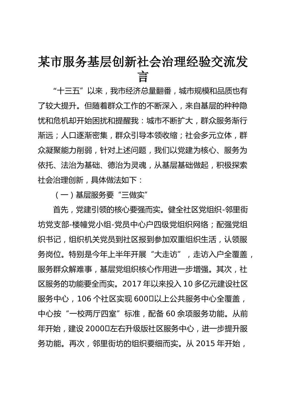 某市服務(wù)基層創(chuàng)新社會(huì)治理經(jīng)驗(yàn)交流發(fā)言