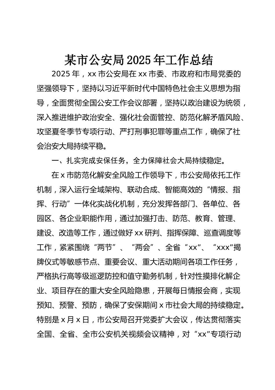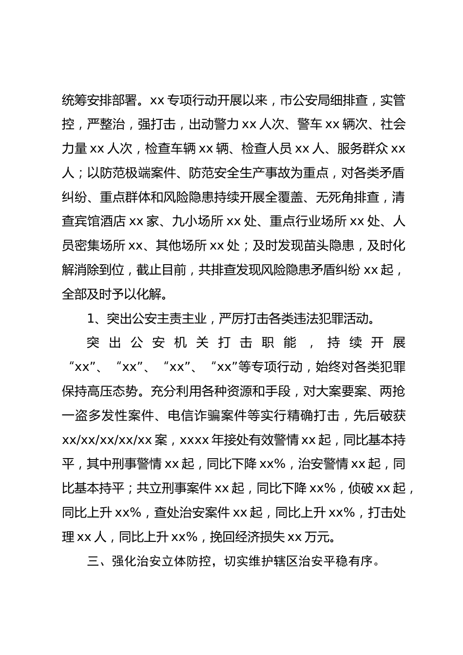 某市公安局2025年工作總結(jié)2025年,xx市公安局在xx市委、市政府和市局黨委的堅強(qiáng)領(lǐng)導(dǎo)下,堅持以習(xí)近平新時代中國特色社會主義思想為指導(dǎo),全面貫徹全國公安工作會議部署,堅持以政治建設(shè)為統(tǒng)領(lǐng),深入推進(jìn)維護(hù)政治安全、強(qiáng)化社會面管控、防范化解矛盾風(fēng)險、攻堅夏冬季節(jié)專項行動、嚴(yán)打刑事犯罪等重點工作,確保了社會治安大局持續(xù)平穩(wěn)。一、扎實完成安保任務(wù),全力保障社會大局持續(xù)穩(wěn)定。在x市防范化解安全風(fēng)險工作領(lǐng)導(dǎo)下,市公安局依托工作機(jī)制,深入運(yùn)行全域架構(gòu)、聯(lián)動合成、智能高效的“情報、指揮、行動”一體化實戰(zhàn)化機(jī)制,充分發(fā)揮各部門、各單位、各園區(qū)、各企業(yè)職...
