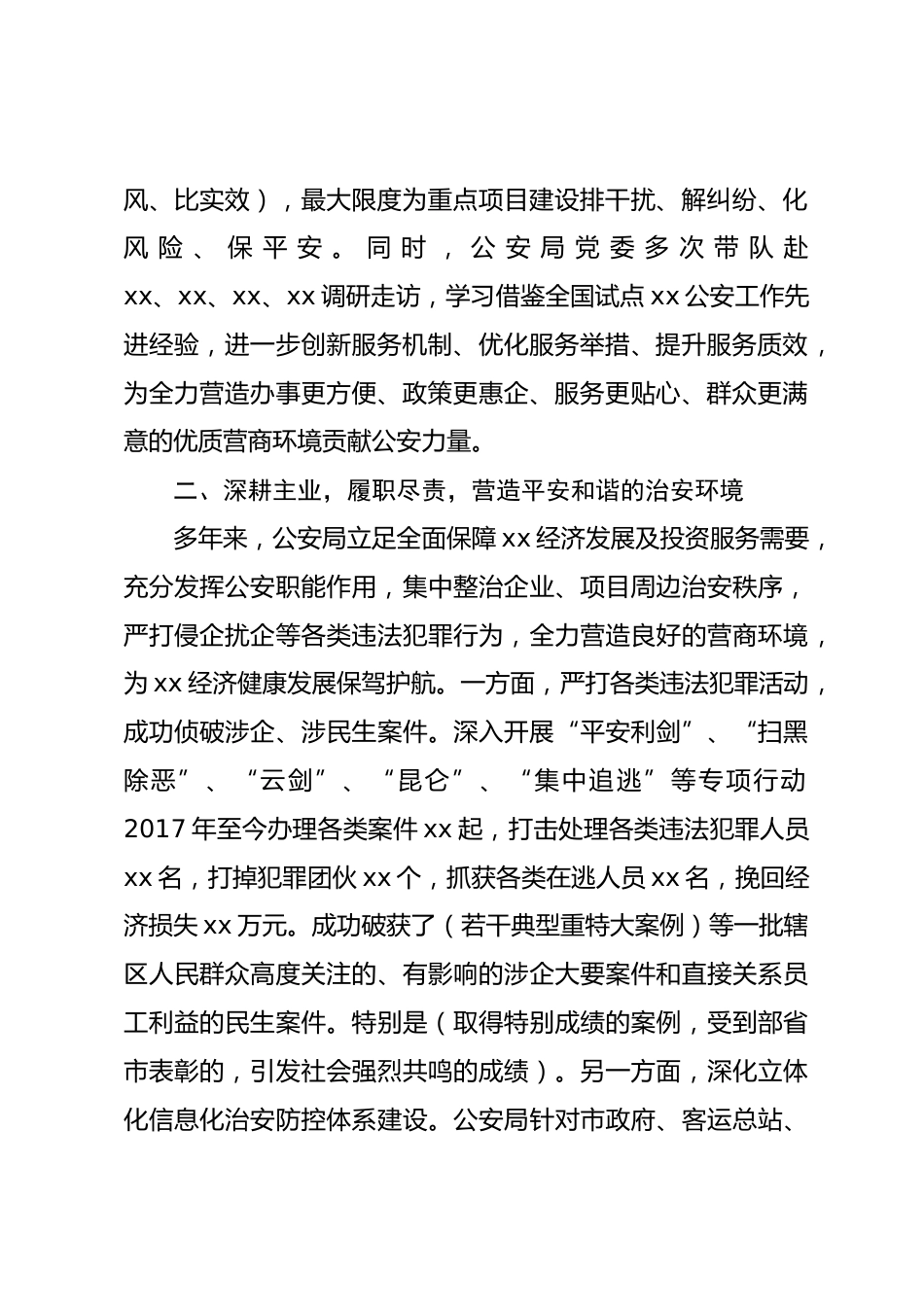 某市公安局近五年優(yōu)化營商環(huán)境工作報告優(yōu)質(zhì)的營商環(huán)境是促進經(jīng)濟健康快速發(fā)展的重要保障。近年來,xx市公安局在上級黨委的堅強領導下,充分發(fā)揮公安機關職能作用,以服務發(fā)展為中心,圍繞優(yōu)化營商環(huán)境,不斷拓展優(yōu)質(zhì)警務品牌內(nèi)涵,努力營造公平正義的法治環(huán)境、安定和諧的治安環(huán)境、優(yōu)質(zhì)高效的服務環(huán)境,在靠前護航全市經(jīng)濟高質(zhì)量發(fā)展中體現(xiàn)了xx公安擔當。一、高位推動,明確職責,營造凝心聚力的使命環(huán)境多年來,xx公安局始終堅持以*******為指導,全面貫徹xx、xx精神及習近平總書記視察調(diào)研xx重要指示精神,認真落實中央、省、市、xx關于優(yōu)化營商環(huán)境的重要部署,以推...