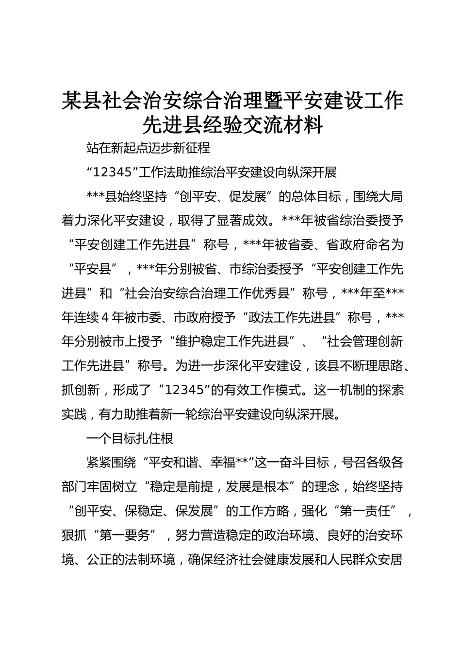 某縣社會治安綜合治理暨平安建設工作先進縣經驗交流材料