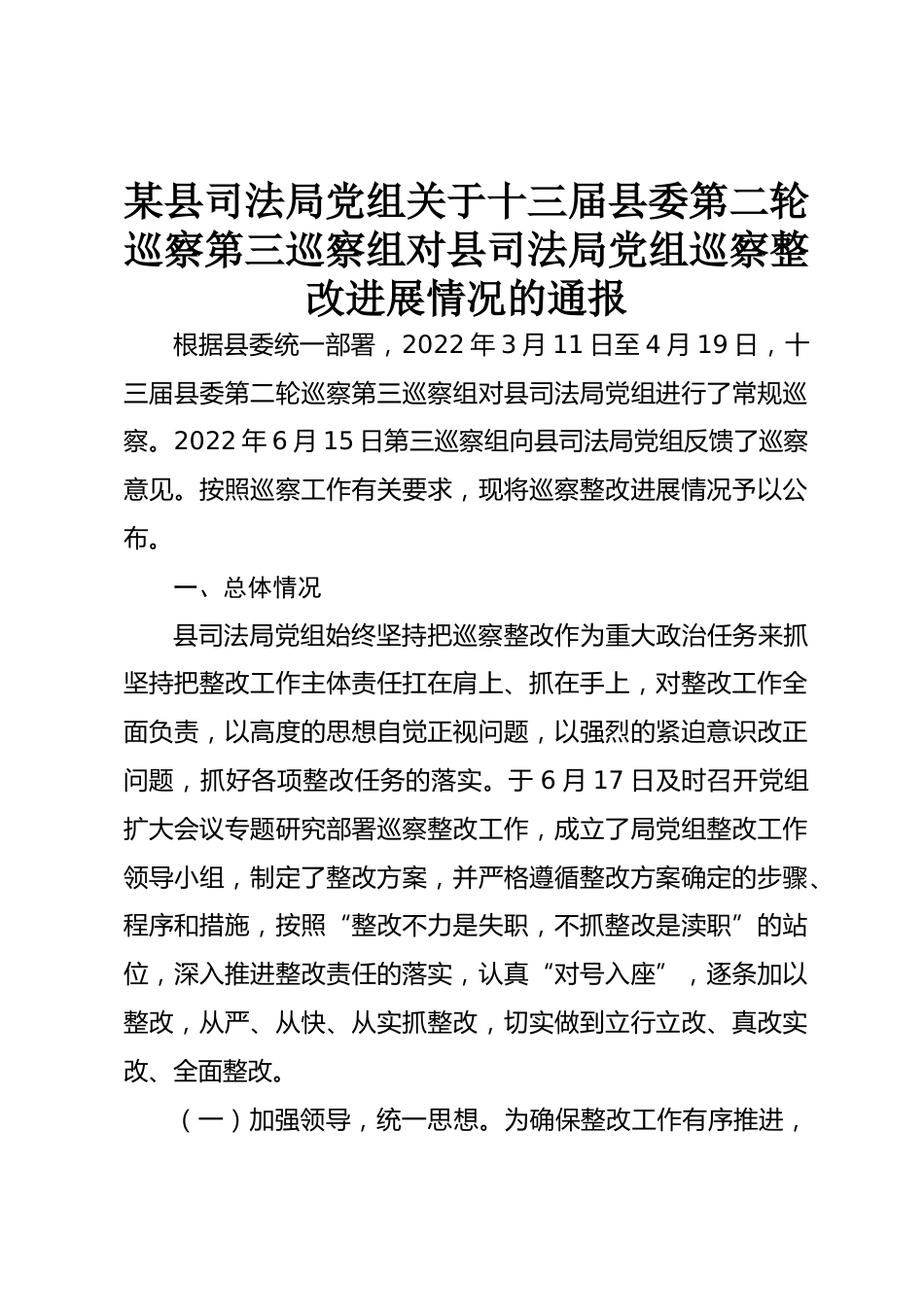 某縣司法局黨組關(guān)于十三屆縣委第二輪巡察第三巡察組對縣司法局黨組巡察整改進(jìn)展情況的通報(bào)