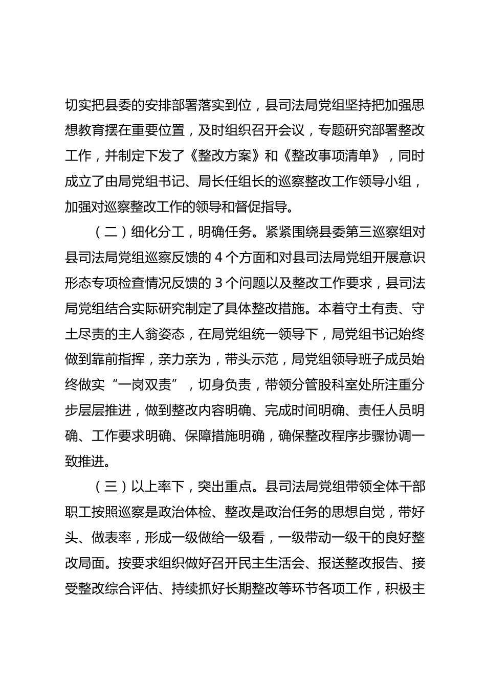 某縣司法局黨組關(guān)于十三屆縣委第二輪巡察第三巡察組對縣司法局黨組巡察整改進(jìn)展情況的通報(bào)根據(jù)縣委統(tǒng)一部署,2022年3月11日至4月19日,十三屆縣委第二輪巡察第三巡察組對縣司法局黨組進(jìn)行了常規(guī)巡察。2022年6月15日第三巡察組向縣司法局黨組反饋了巡察意見。按照巡察工作有關(guān)要求,現(xiàn)將巡察整改進(jìn)展情況予以公布。一、總體情況縣司法局黨組始終堅(jiān)持把巡察整改作為重大政治任務(wù)來抓堅(jiān)持把整改工作主體責(zé)任扛在肩上、抓在手上,對整改工作全面負(fù)責(zé),以高度的思想自覺正視問題,以強(qiáng)烈的緊迫意識改正問題,抓好各項(xiàng)整改任務(wù)的落實(shí)。于6月17日及時(shí)召開黨組擴(kuò)大會議專題研究部...