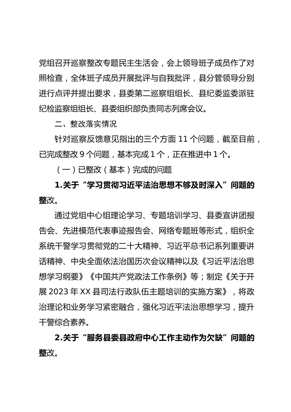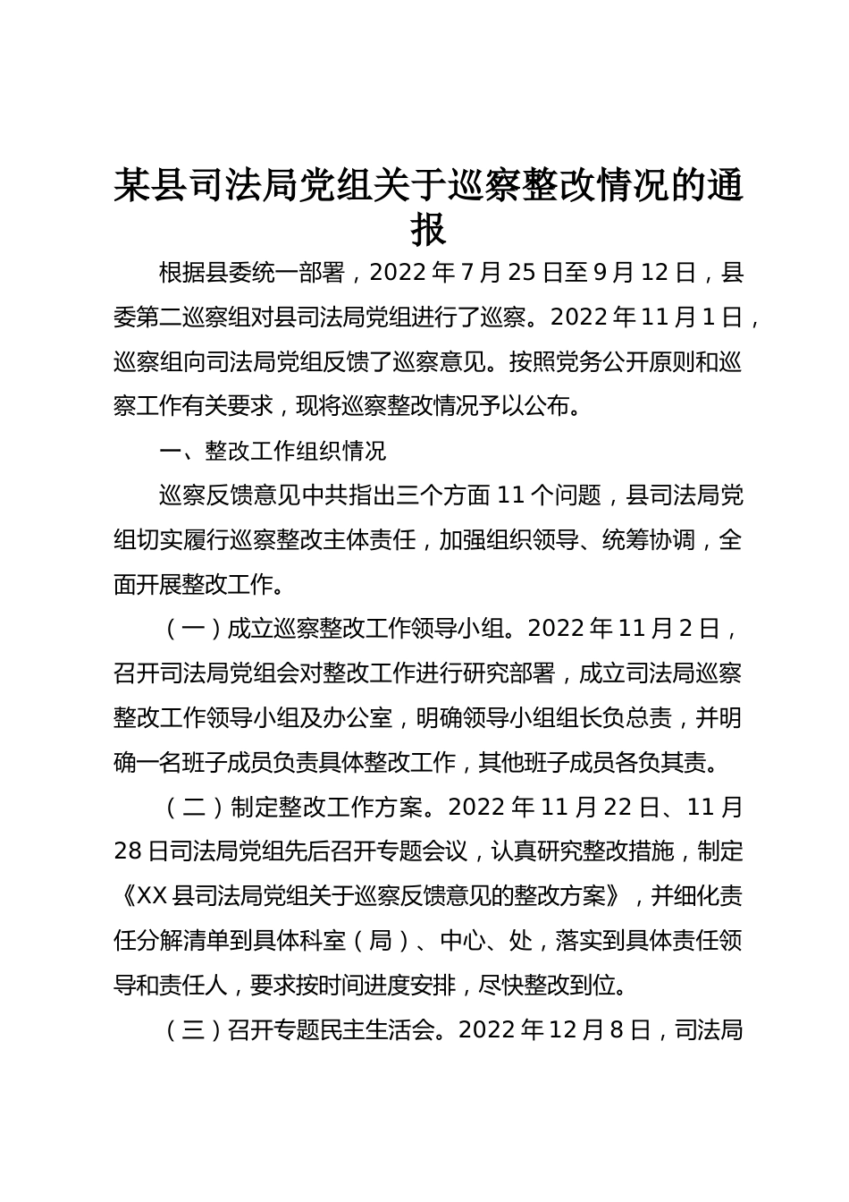 某縣司法局黨組關(guān)于巡察整改情況的通報(bào)根據(jù)縣委統(tǒng)一部署,2022年7月25日至9月12日,縣委第二巡察組對(duì)縣司法局黨組進(jìn)行了巡察。2022年11月1日,巡察組向司法局黨組反饋了巡察意見(jiàn)。按照黨務(wù)公開(kāi)原則和巡察工作有關(guān)要求,現(xiàn)將巡察整改情況予以公布。一、整改工作組織情況巡察反饋意見(jiàn)中共指出三個(gè)方面11個(gè)問(wèn)題,縣司法局黨組切實(shí)履行巡察整改主體責(zé)任,加強(qiáng)組織領(lǐng)導(dǎo)、統(tǒng)籌協(xié)調(diào),全面開(kāi)展整改工作。(一)成立巡察整改工作領(lǐng)導(dǎo)小組。2022年11月2日,召開(kāi)司法局黨組會(huì)對(duì)整改工作進(jìn)行研究部署,成立司法局巡察整改工作領(lǐng)導(dǎo)小組及辦公室,明確領(lǐng)導(dǎo)小組組長(zhǎng)負(fù)總責(zé),并明確一名班...