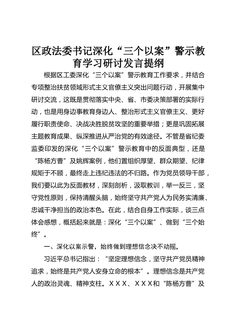 區(qū)政法委書記深化“三個以案”警示教育學習研討發(fā)言提綱