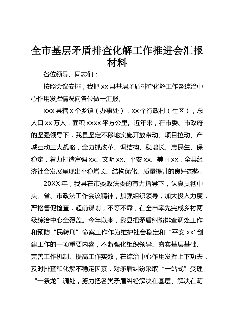 全市基層矛盾排查化解工作推進會匯報材料各位領(lǐng)導(dǎo)、同志們:按照會議安排,我把xx縣基層矛盾排查化解工作暨綜治中心作用發(fā)揮情況向各位做一匯報。xxx縣轄x個鄉(xiāng)鎮(zhèn)(辦事處),xx個行政村(社區(qū)),總?cè)丝趚x萬人,面積xxxx平方公里。近年來,在市委、市政府的堅強領(lǐng)導(dǎo)下,我縣堅定不移地實施開放帶動、項目拉動、產(chǎn)城互動三大戰(zhàn)略,全力抓改革、調(diào)結(jié)構(gòu)、穩(wěn)增長、惠民生、保穩(wěn)定,著力打造富強xx、文明xx、平安xx、美麗xx,全縣經(jīng)濟社會發(fā)展呈現(xiàn)出平穩(wěn)增長、結(jié)構(gòu)優(yōu)化、質(zhì)量提升的良好態(tài)勢。20XX年,我縣在市委政法委的有力指導(dǎo)下,認真貫徹中央、省、市政法工作會議精神,加...