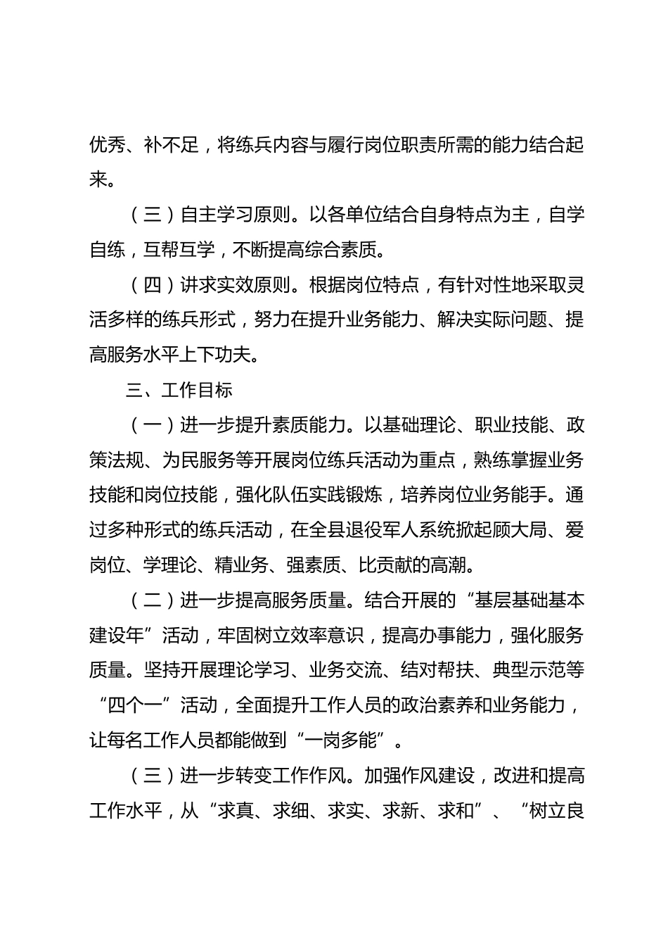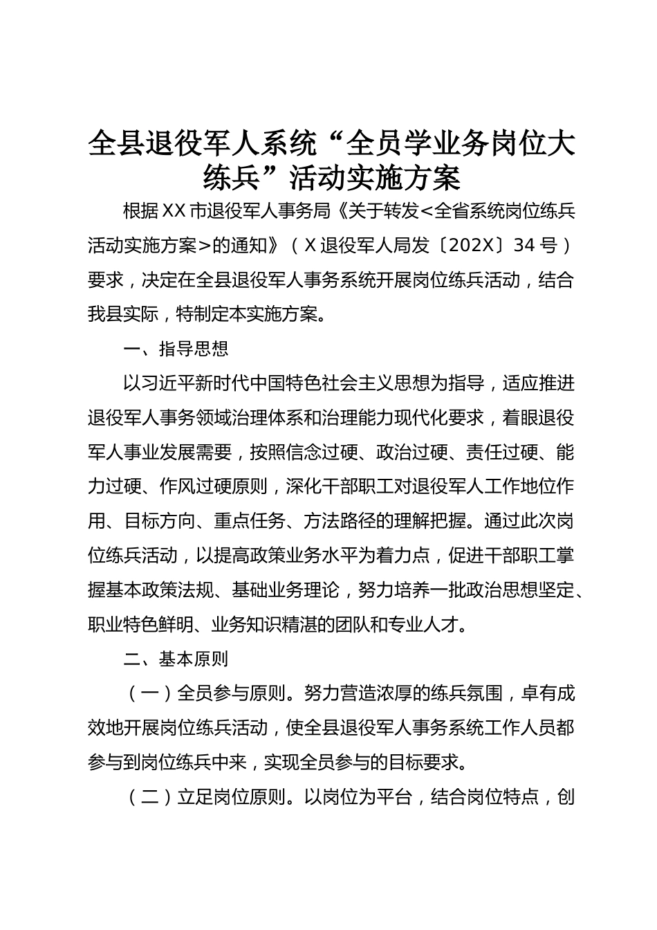 全縣退役軍人系統(tǒng)“全員學(xué)業(yè)務(wù)崗位大練兵”活動實(shí)施方案根據(jù)XX市退役軍人事務(wù)局《關(guān)于轉(zhuǎn)發(fā)<全省系統(tǒng)崗位練兵活動實(shí)施方案>的通知》(X退役軍人局發(fā)〔202X〕34號)要求,決定在全縣退役軍人事務(wù)系統(tǒng)開展崗位練兵活動,結(jié)合我縣實(shí)際,特制定本實(shí)施方案。一、指導(dǎo)思想以習(xí)近平新時代中國特色社會主義思想為指導(dǎo),適應(yīng)推進(jìn)退役軍人事務(wù)領(lǐng)域治理體系和治理能力現(xiàn)代化要求,著眼退役軍人事業(yè)發(fā)展需要,按照信念過硬、政治過硬、責(zé)任過硬、能力過硬、作風(fēng)過硬原則,深化干部職工對退役軍人工作地位作用、目標(biāo)方向、重點(diǎn)任務(wù)、方法路徑的理解把握。通過此次崗位練兵活動,以提高...
