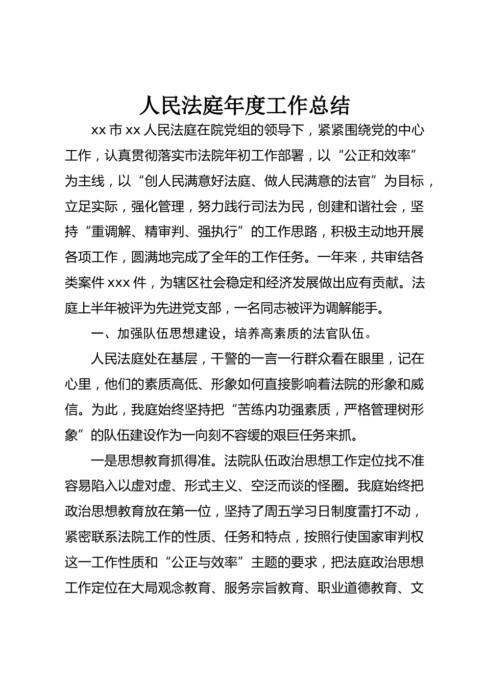 人民法庭年度工作總結(jié)xx市xx人民法庭在院黨組的領(lǐng)導(dǎo)下,緊緊圍繞黨的中心工作,認(rèn)真貫徹落實(shí)市法院年初工作部署,以“公正和效率”為主線,以“創(chuàng)人民滿意好法庭、做人民滿意的法官”為目標(biāo),立足實(shí)際,強(qiáng)化管理,努力踐行司法為民,創(chuàng)建和諧社會(huì),堅(jiān)持“重調(diào)解、精審判、強(qiáng)執(zhí)行”的工作思路,積極主動(dòng)地開展各項(xiàng)工作,圓滿地完成了全年的工作任務(wù)。一年來,共審結(jié)各類案件xxx件,為轄區(qū)社會(huì)穩(wěn)定和經(jīng)濟(jì)發(fā)展做出應(yīng)有貢獻(xiàn)。法庭上半年被評(píng)為先進(jìn)黨支部,一名同志被評(píng)為調(diào)解能手。一、加強(qiáng)隊(duì)伍思想建設(shè),培養(yǎng)高素質(zhì)的法官隊(duì)伍。人民法庭處在基層,干警的一言一行群眾看在眼...
