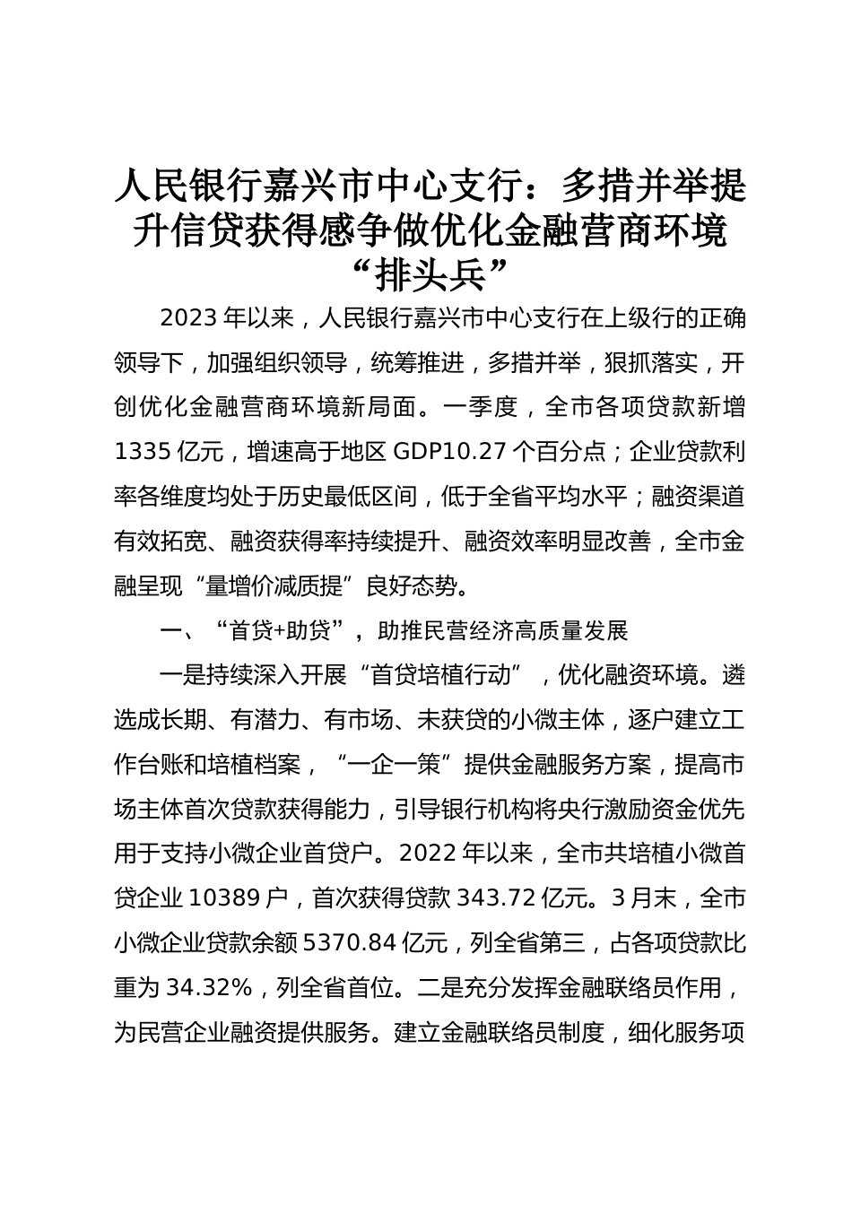 人民銀行嘉興市中心支行:多措并舉提升信貸獲得感爭(zhēng)做優(yōu)化金融營(yíng)商環(huán)境“排頭兵”2023年以來(lái),人民銀行嘉興市中心支行在上級(jí)行的正確領(lǐng)導(dǎo)下,加強(qiáng)組織領(lǐng)導(dǎo),統(tǒng)籌推進(jìn),多措并舉,狠抓落實(shí),開(kāi)創(chuàng)優(yōu)化金融營(yíng)商環(huán)境新局面。一季度,全市各項(xiàng)貸款新增1335億元,增速高于地區(qū)GDP10.27個(gè)百分點(diǎn);企業(yè)貸款利率各維度均處于歷史最低區(qū)間,低于全省平均水平;融資渠道有效拓寬、融資獲得率持續(xù)提升、融資效率明顯改善,全市金融呈現(xiàn)“量增價(jià)減質(zhì)提”良好態(tài)勢(shì)。一、“首貸+助貸”,助推民營(yíng)經(jīng)濟(jì)高質(zhì)量發(fā)展一是持續(xù)深入開(kāi)展“首貸培植行動(dòng)”,優(yōu)化融資環(huán)境。遴選成長(zhǎng)期、有潛力、有...