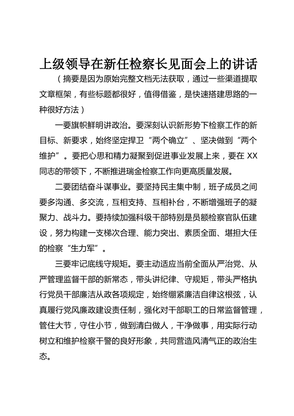 上級領(lǐng)導(dǎo)在新任檢察長見面會上的講話(摘要是因?yàn)樵纪暾臋n無法獲取,通過一些渠道提取文章框架,有些標(biāo)題都很好,值得借鑒,是快速搭建思路的一種很好方法)一要旗幟鮮明講政治。要深刻認(rèn)識新形勢下檢察工作的新目標(biāo)、新要求,始終堅(jiān)定捍衛(wèi)“兩個確立”、堅(jiān)決做到“兩個維護(hù)”。要把心思和精力凝聚到促進(jìn)事業(yè)發(fā)展上來,要在XX同志的帶領(lǐng)下,不斷推進(jìn)瑞金檢察工作向更高質(zhì)量發(fā)展。二要團(tuán)結(jié)奮斗謀事業(yè)。要堅(jiān)持民主集中制,班子成員之間要多溝通、多交流,互相支持、互相補(bǔ)臺,不斷增強(qiáng)班子的凝聚力、戰(zhàn)斗力。要持續(xù)加強(qiáng)科級干部特別是員額檢察官隊(duì)伍建設(shè),努力構(gòu)建一支...