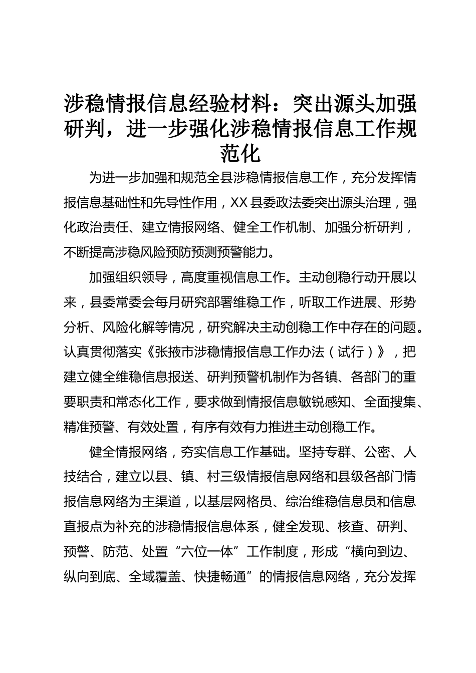 涉穩(wěn)情報(bào)信息經(jīng)驗(yàn)材料:突出源頭加強(qiáng)研判,進(jìn)一步強(qiáng)化涉穩(wěn)情報(bào)信息工作規(guī)范化為進(jìn)一步加強(qiáng)和規(guī)范全縣涉穩(wěn)情報(bào)信息工作,充分發(fā)揮情報(bào)信息基礎(chǔ)性和先導(dǎo)性作用,XX縣委政法委突出源頭治理,強(qiáng)化政治責(zé)任、建立情報(bào)網(wǎng)絡(luò)、健全工作機(jī)制、加強(qiáng)分析研判,不斷提高涉穩(wěn)風(fēng)險(xiǎn)預(yù)防預(yù)測預(yù)警能力。加強(qiáng)組織領(lǐng)導(dǎo),高度重視信息工作。主動(dòng)創(chuàng)穩(wěn)行動(dòng)開展以來,縣委常委會(huì)每月研究部署維穩(wěn)工作,聽取工作進(jìn)展、形勢分析、風(fēng)險(xiǎn)化解等情況,研究解決主動(dòng)創(chuàng)穩(wěn)工作中存在的問題。認(rèn)真貫徹落實(shí)《張掖市涉穩(wěn)情報(bào)信息工作辦法(試行)》,把建立健全維穩(wěn)信息報(bào)送、研判預(yù)警機(jī)制作為各鎮(zhèn)、各部門的...