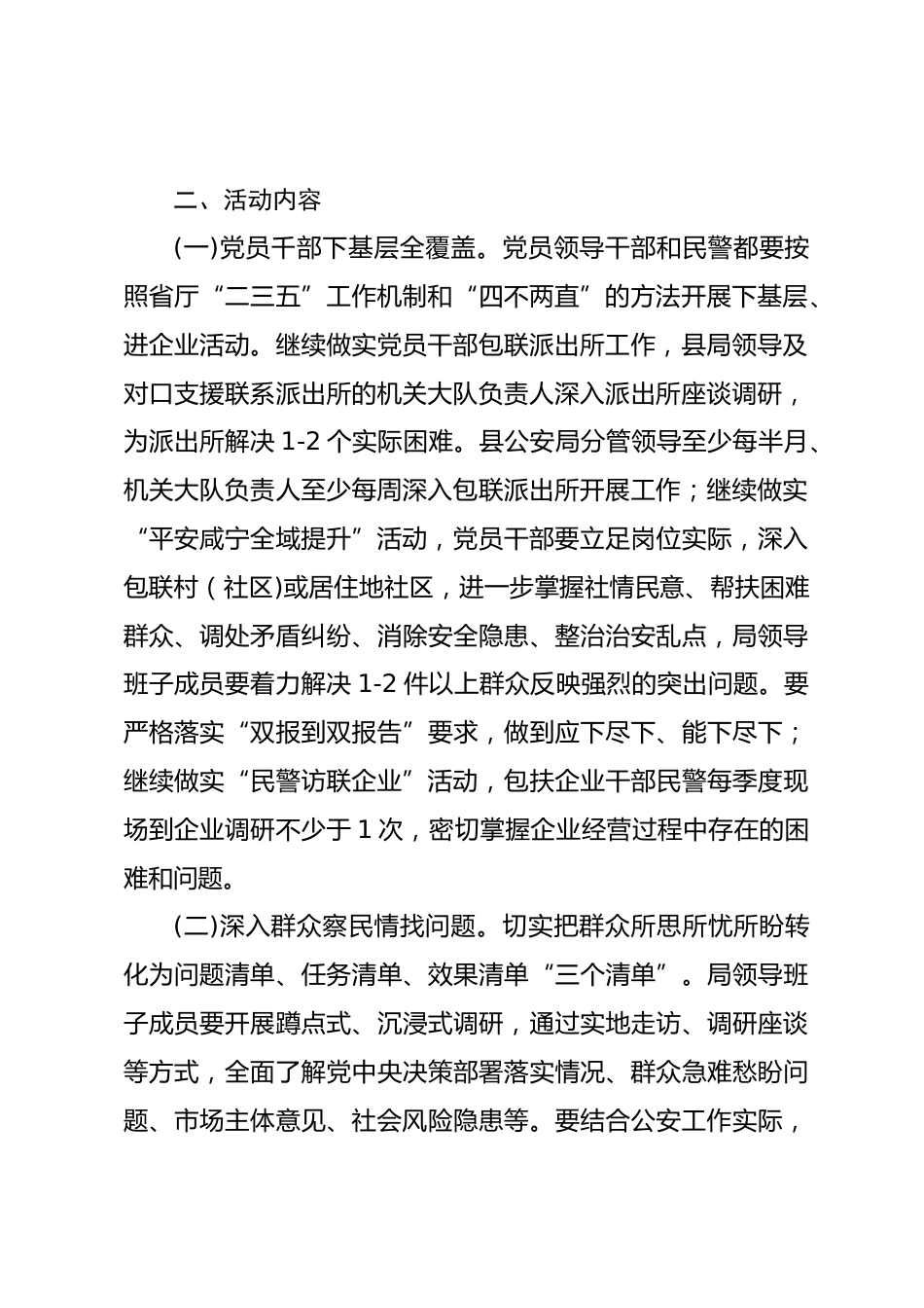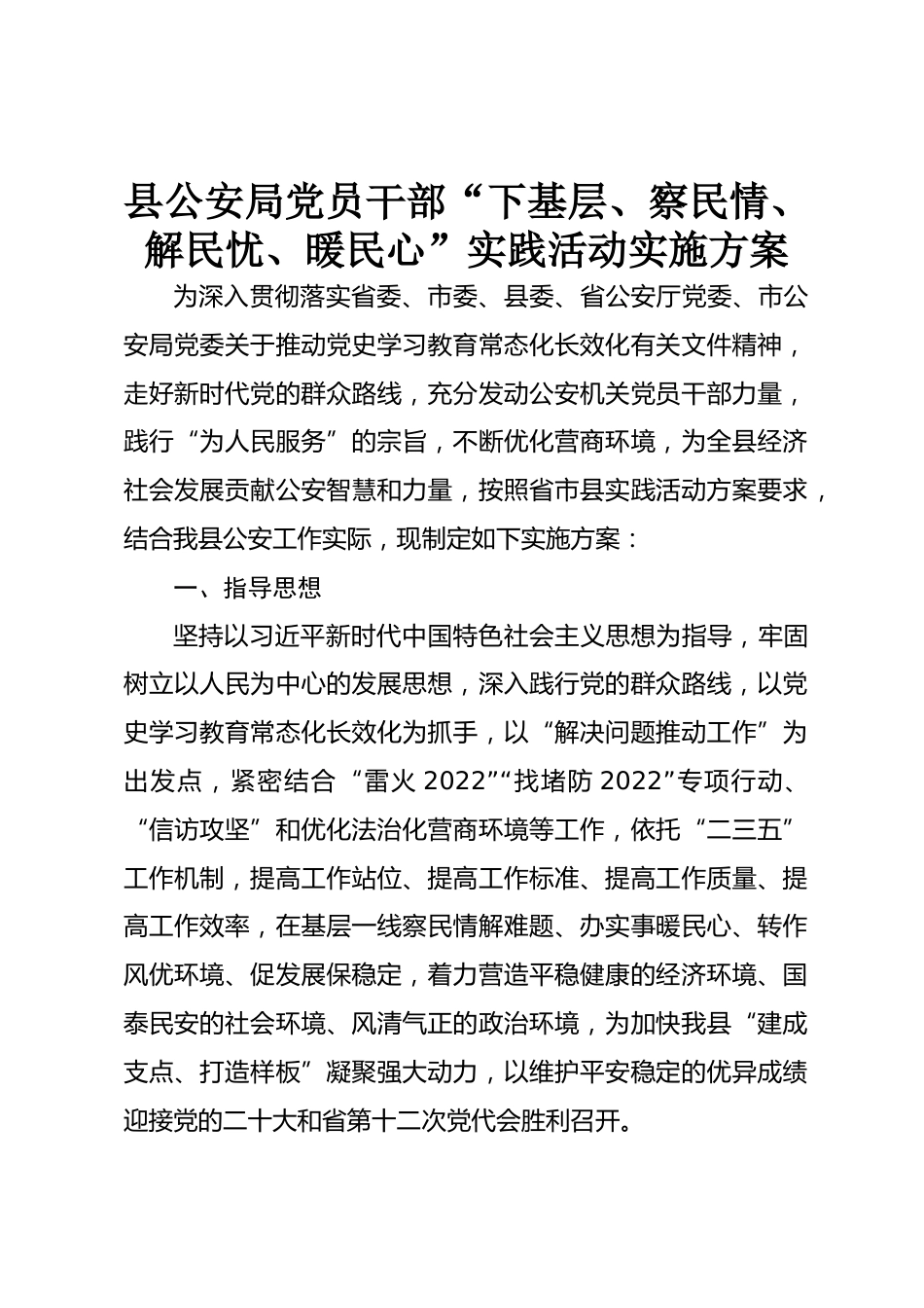 縣公安局黨員干部“下基層、察民情、解民憂、暖民心”實(shí)踐活動(dòng)實(shí)施方案為深入貫徹落實(shí)省委、市委、縣委、省公安廳黨委、市公安局黨委關(guān)于推動(dòng)黨史學(xué)習(xí)教育常態(tài)化長(zhǎng)效化有關(guān)文件精神,走好新時(shí)代黨的群眾路線,充分發(fā)動(dòng)公安機(jī)關(guān)黨員干部力量,踐行“為人民服務(wù)”的宗旨,不斷優(yōu)化營商環(huán)境,為全縣經(jīng)濟(jì)社會(huì)發(fā)展貢獻(xiàn)公安智慧和力量,按照省市縣實(shí)踐活動(dòng)方案要求,結(jié)合我縣公安工作實(shí)際,現(xiàn)制定如下實(shí)施方案:一、指導(dǎo)思想堅(jiān)持以習(xí)近平新時(shí)代中國特色社會(huì)主義思想為指導(dǎo),牢固樹立以人民為中心的發(fā)展思想,深入踐行黨的群眾路線,以黨史學(xué)習(xí)教育常態(tài)化長(zhǎng)效化為抓手,以“解決...