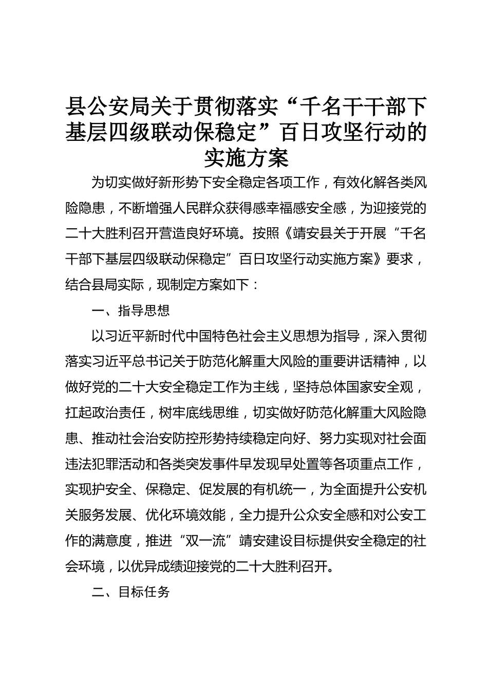 縣公安局關(guān)于貫徹落實(shí)“千名干干部下基層 四級聯(lián)動保穩(wěn)定”百日攻堅行動的實(shí)施方案VIP免費(fèi)