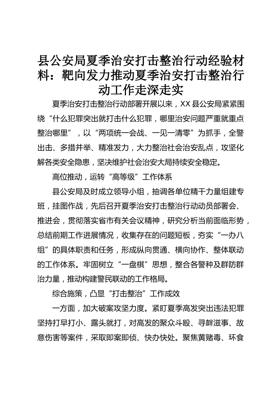 縣公安局夏季治安打擊整治行動(dòng)經(jīng)驗(yàn)材料:靶向發(fā)力 推動(dòng)夏季治安打擊整治行動(dòng)工作走深走實(shí)