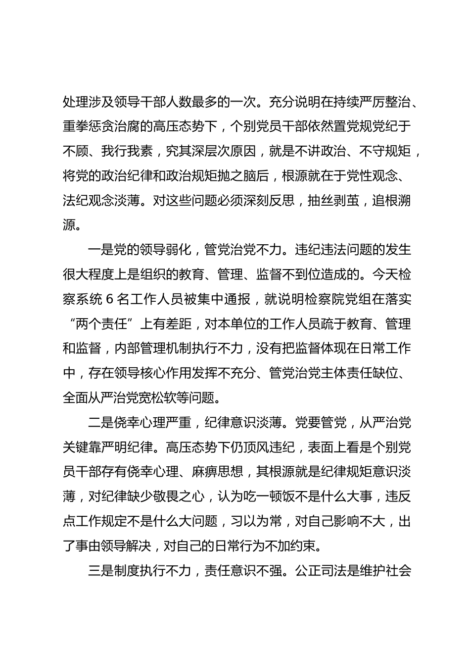縣紀(jì)委書記在政法系統(tǒng)警示教育大會上的講話同志們:今天我們召開這次案件通報(bào)會,主要目的是深入學(xué)習(xí)貫徹習(xí)近平新時代中國特色社會主義思想,以身邊的違紀(jì)違法典型案件為反面教材,汲取教訓(xùn)、警鐘長鳴,教育引導(dǎo)政法系統(tǒng)黨員干部嚴(yán)守黨章黨規(guī)黨紀(jì),牢記初心使命,堅(jiān)定不移推動全面從嚴(yán)治黨向縱深發(fā)展,持續(xù)鞏固和發(fā)展風(fēng)清氣正的良好政治生態(tài)。剛才,**同志通報(bào)了6名干部的處理處分情況,被處理處分的同志都是我們朝夕相處熟識的領(lǐng)導(dǎo)、同事,相信大家都受到了很大觸動。通報(bào)的這些問題,從表面上看是違法廉潔紀(jì)律、違法工作規(guī)定等作風(fēng)問題,從根本上講是個別黨員干部思想...