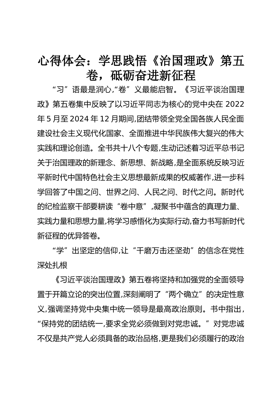 心得體會(huì):學(xué)思踐悟《治國理政》第五卷,砥礪奮進(jìn)新征程“習(xí)”語最是潤心,“卷”義最能啟智?!读?xí)近平談治國理政》第五卷集中反映了以習(xí)近平同志為核心的黨中央在2022年5月至2024年12月期間,團(tuán)結(jié)帶領(lǐng)全黨全國各族人民全面建設(shè)社會(huì)主義現(xiàn)代化國家、全面推進(jìn)中華民族偉大復(fù)興的偉大實(shí)踐和理論創(chuàng)造。全書共十八個(gè)專題,生動(dòng)記述著習(xí)近平總書記關(guān)于治國理政的新理念、新思想、新戰(zhàn)略,是全面系統(tǒng)反映習(xí)近平新時(shí)代中國特色社會(huì)主義思想最新成果的權(quán)威著作,進(jìn)一步科學(xué)回答了中國之問、世界之問、人民之問、時(shí)代之問。新時(shí)代的紀(jì)檢監(jiān)察干部要耕讀“卷中意”,凝聚書中蘊(yùn)含的真理力...