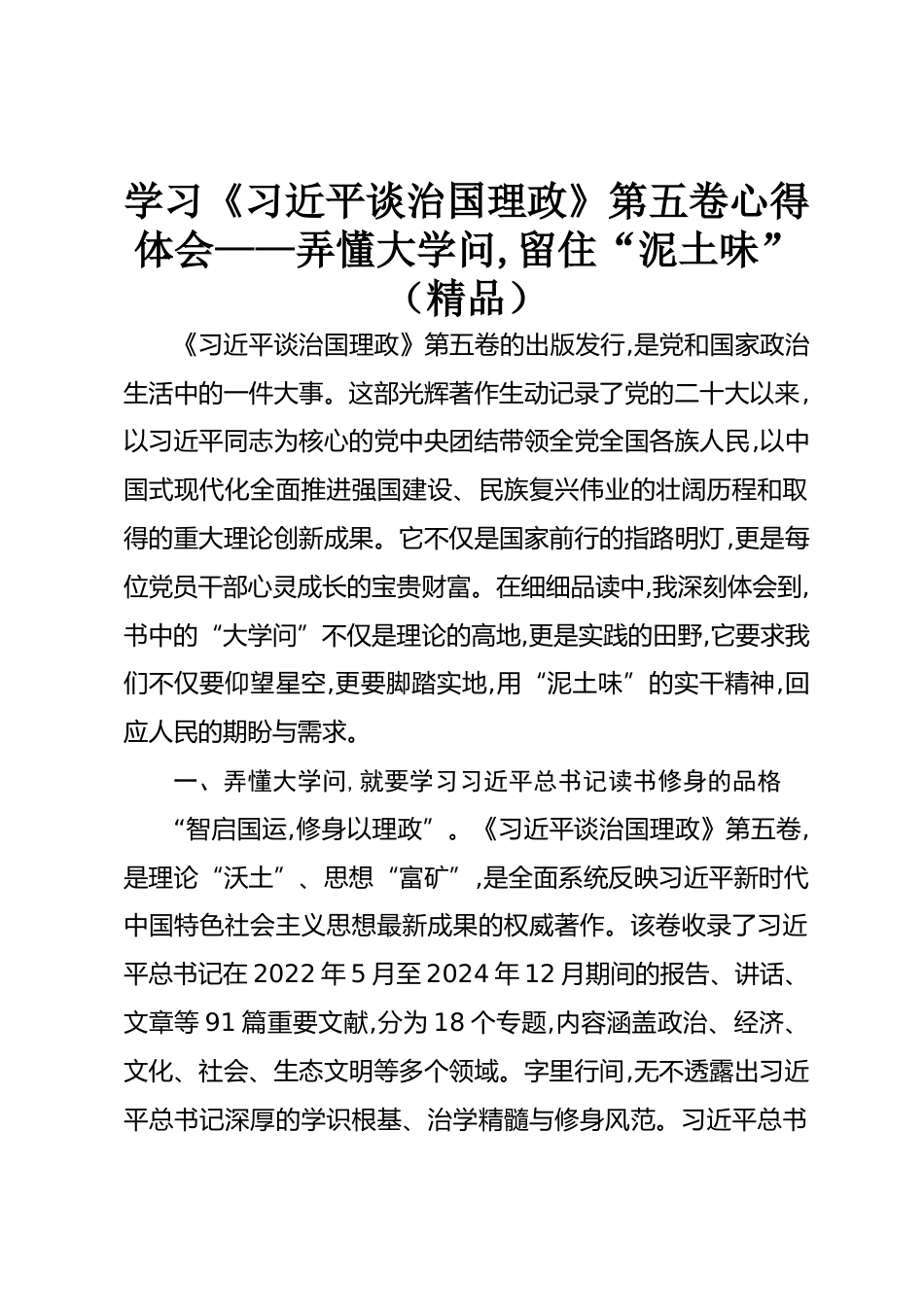 學(xué)習(xí)《習(xí)近平談治國理政》第五卷心得體會——弄懂大學(xué)問,留住“泥土味”(精品)《習(xí)近平談治國理政》第五卷的出版發(fā)行,是黨和國家政治生活中的一件大事。這部光輝著作生動記錄了黨的二十大以來,以習(xí)近平同志為核心的黨中央團(tuán)結(jié)帶領(lǐng)全黨全國各族人民,以中國式現(xiàn)代化全面推進(jìn)強(qiáng)國建設(shè)、民族復(fù)興偉業(yè)的壯闊歷程和取得的重大理論創(chuàng)新成果。它不僅是國家前行的指路明燈,更是每位黨員干部心靈成長的寶貴財富。在細(xì)細(xì)品讀中,我深刻體會到,書中的“大學(xué)問”不僅是理論的高地,更是實(shí)踐的田野,它要求我們不僅要仰望星空,更要腳踏實(shí)地,用“泥土味”的實(shí)干精神,回應(yīng)人民的期盼與需求...