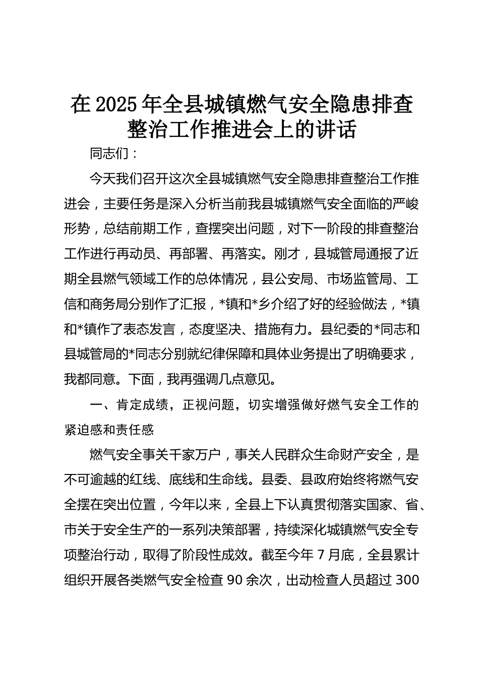 在2025年全縣城鎮(zhèn)燃?xì)獍踩[患排查整治工作推進(jìn)會上的講話