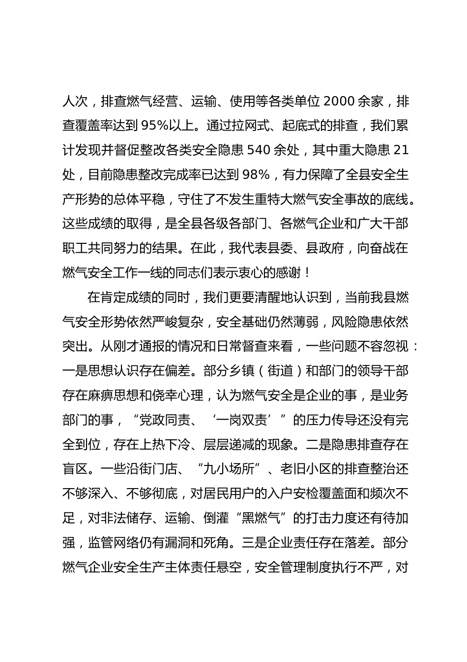 在2025年全縣城鎮(zhèn)燃?xì)獍踩[患排查整治工作推進(jìn)會上的講話同志們:今天我們召開這次全縣城鎮(zhèn)燃?xì)獍踩[患排查整治工作推進(jìn)會,主要任務(wù)是深入分析當(dāng)前我縣城鎮(zhèn)燃?xì)獍踩媾R的嚴(yán)峻形勢,總結(jié)前期工作,查擺突出問題,對下一階段的排查整治工作進(jìn)行再動員、再部署、再落實。剛才,縣城管局通報了近期全縣燃?xì)忸I(lǐng)域工作的總體情況,縣公安局、市場監(jiān)管局、工信和商務(wù)局分別作了匯報,*鎮(zhèn)和*鄉(xiāng)介紹了好的經(jīng)驗做法,*鎮(zhèn)和*鎮(zhèn)作了表態(tài)發(fā)言,態(tài)度堅決、措施有力??h紀(jì)委的*同志和縣城管局的*同志分別就紀(jì)律保障和具體業(yè)務(wù)提出了明確要求,我都同意。下面,我再強(qiáng)調(diào)幾點意見。一、...