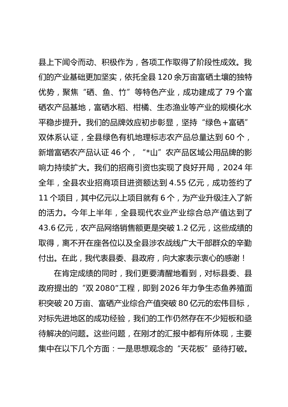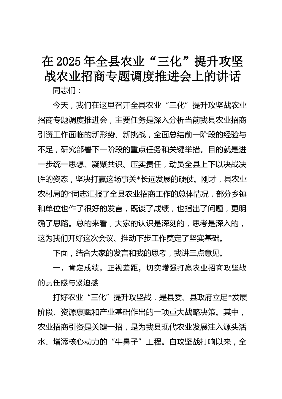 在2025年全縣農(nóng)業(yè)“三化”提升攻堅戰(zhàn)農(nóng)業(yè)招商專題調(diào)度推進會上的講話