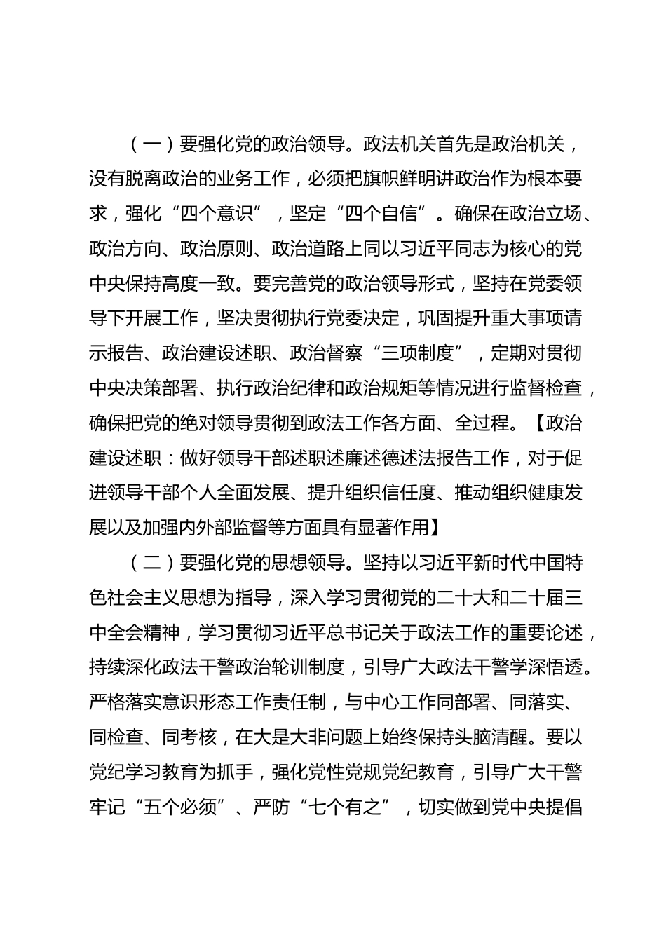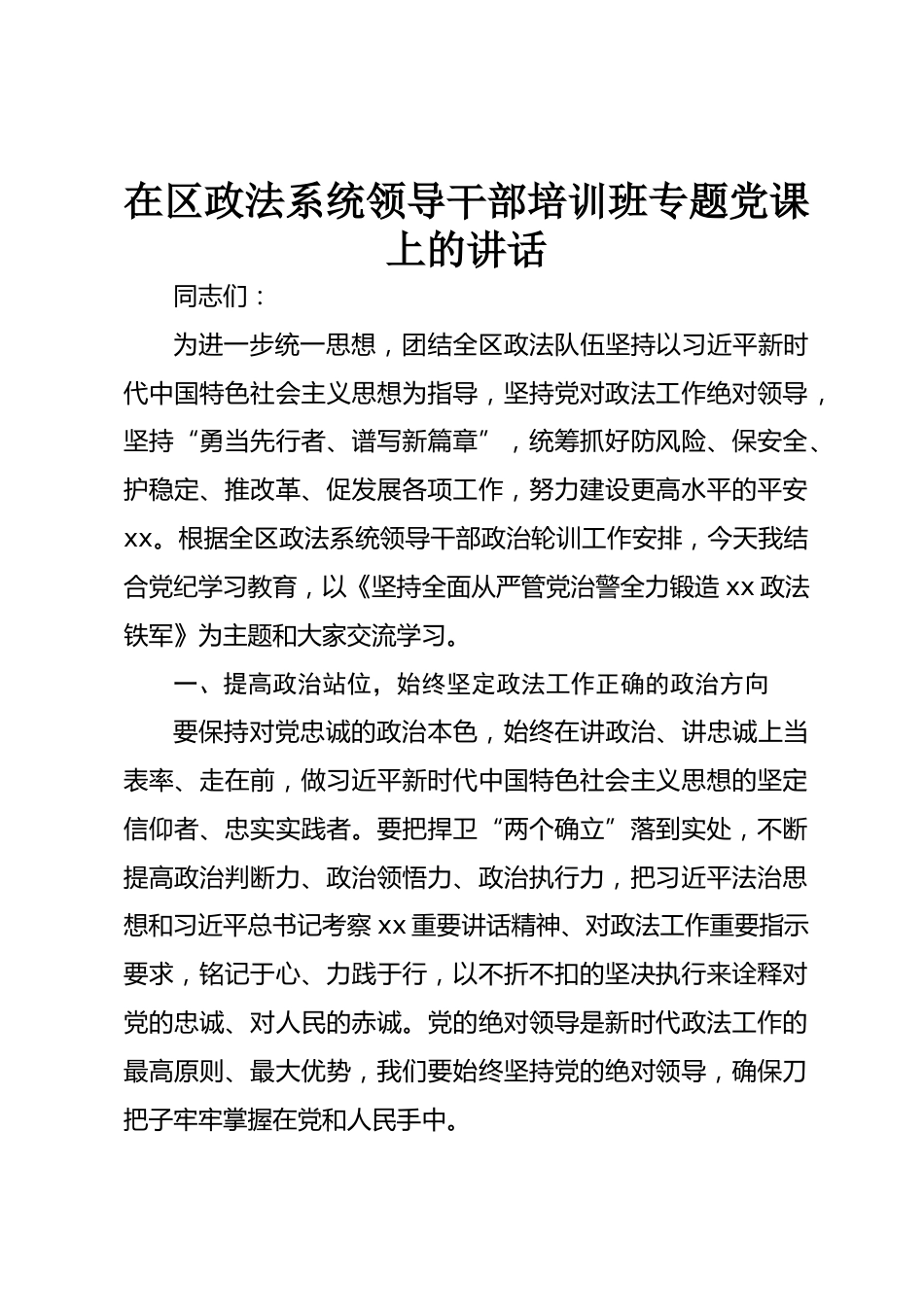 在區(qū)政法系統(tǒng)領(lǐng)導(dǎo)干部培訓(xùn)班專題黨課上的講話同志們:為進(jìn)一步統(tǒng)一思想,團(tuán)結(jié)全區(qū)政法隊(duì)伍堅(jiān)持以習(xí)近平新時(shí)代中國(guó)特色社會(huì)主義思想為指導(dǎo),堅(jiān)持黨對(duì)政法工作絕對(duì)領(lǐng)導(dǎo),堅(jiān)持“勇當(dāng)先行者、譜寫新篇章”,統(tǒng)籌抓好防風(fēng)險(xiǎn)、保安全、護(hù)穩(wěn)定、推改革、促發(fā)展各項(xiàng)工作,努力建設(shè)更高水平的平安xx。根據(jù)全區(qū)政法系統(tǒng)領(lǐng)導(dǎo)干部政治輪訓(xùn)工作安排,今天我結(jié)合黨紀(jì)學(xué)習(xí)教育,以《堅(jiān)持全面從嚴(yán)管黨治警全力鍛造xx政法鐵軍》為主題和大家交流學(xué)習(xí)。一、提高政治站位,始終堅(jiān)定政法工作正確的政治方向要保持對(duì)黨忠誠(chéng)的政治本色,始終在講政治、講忠誠(chéng)上當(dāng)表率、走在前,做習(xí)近平新時(shí)代中...