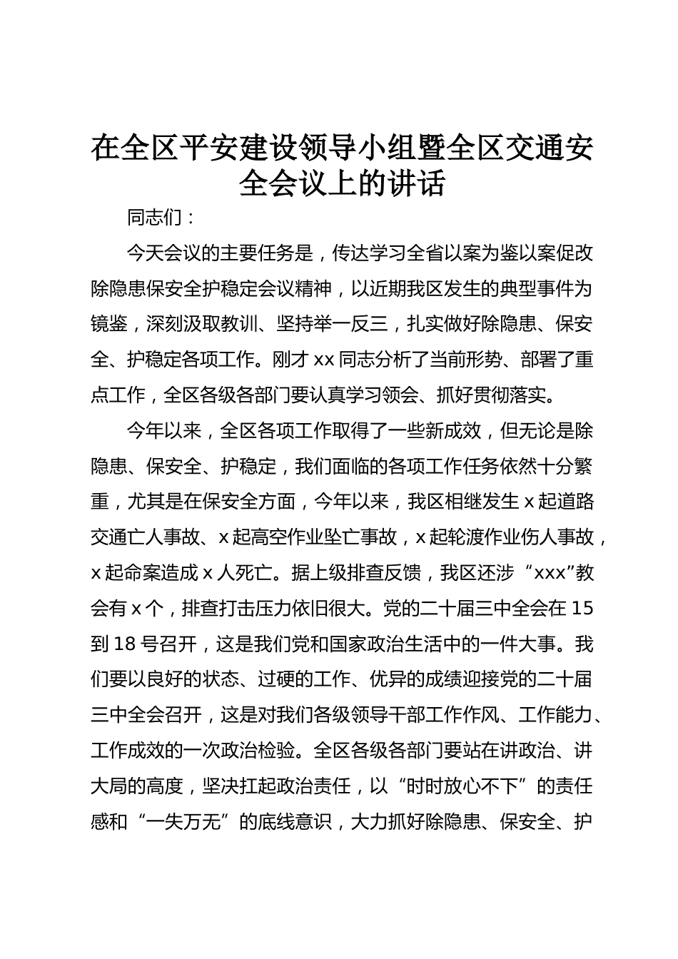 在全區(qū)平安建設領導小組暨全區(qū)交通安全會議上的講話