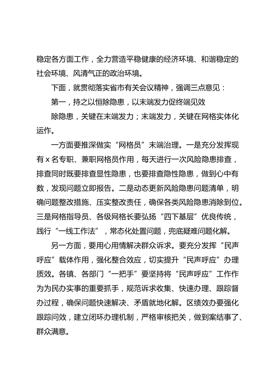 在全區(qū)平安建設領導小組暨全區(qū)交通安全會議上的講話同志們:今天會議的主要任務是,傳達學習全省以案為鑒以案促改除隱患保安全護穩(wěn)定會議精神,以近期我區(qū)發(fā)生的典型事件為鏡鑒,深刻汲取教訓、堅持舉一反三,扎實做好除隱患、保安全、護穩(wěn)定各項工作。剛才xx同志分析了當前形勢、部署了重點工作,全區(qū)各級各部門要認真學習領會、抓好貫徹落實。今年以來,全區(qū)各項工作取得了一些新成效,但無論是除隱患、保安全、護穩(wěn)定,我們面臨的各項工作任務依然十分繁重,尤其是在保安全方面,今年以來,我區(qū)相繼發(fā)生x起道路交通亡人事故、x起高空作業(yè)墜亡事故,x起輪渡作業(yè)傷人事...