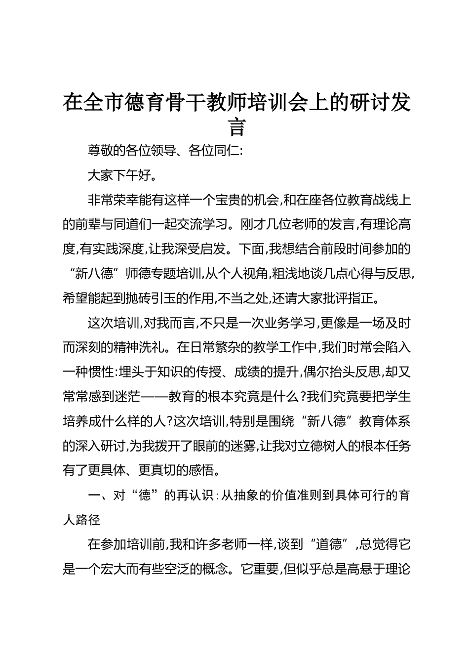 在全市德育骨干教師培訓(xùn)會(huì)上的研討發(fā)言尊敬的各位領(lǐng)導(dǎo)、各位同仁:大家下午好。非常榮幸能有這樣一個(gè)寶貴的機(jī)會(huì),和在座各位教育戰(zhàn)線(xiàn)上的前輩與同道們一起交流學(xué)習(xí)。剛才幾位老師的發(fā)言,有理論高度,有實(shí)踐深度,讓我深受啟發(fā)。下面,我想結(jié)合前段時(shí)間參加的“新八德”師德專(zhuān)題培訓(xùn),從個(gè)人視角,粗淺地談幾點(diǎn)心得與反思,希望能起到拋磚引玉的作用,不當(dāng)之處,還請(qǐng)大家批評(píng)指正。這次培訓(xùn),對(duì)我而言,不只是一次業(yè)務(wù)學(xué)習(xí),更像是一場(chǎng)及時(shí)而深刻的精神洗禮。在日常繁雜的教學(xué)工作中,我們時(shí)常會(huì)陷入一種慣性:埋頭于知識(shí)的傳授、成績(jī)的提升,偶爾抬頭反思,卻又常常感到迷?!逃母?..